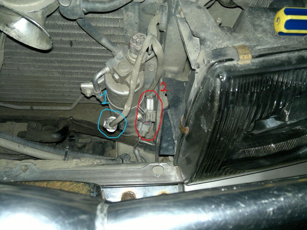 Доброго времени суток! подскажите где датчик температуры забортного воздуха? на фото он должен цепляться к фишке №1 или он под номером 2? Авто - паджеро 93 года правый руль