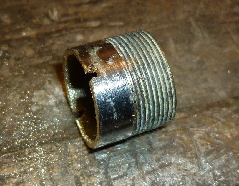 Подправил пасатижами, впомнил про технологию 4-х летней давности, нашёл последнюю трубку с резьбой, ну и проделал вот так: