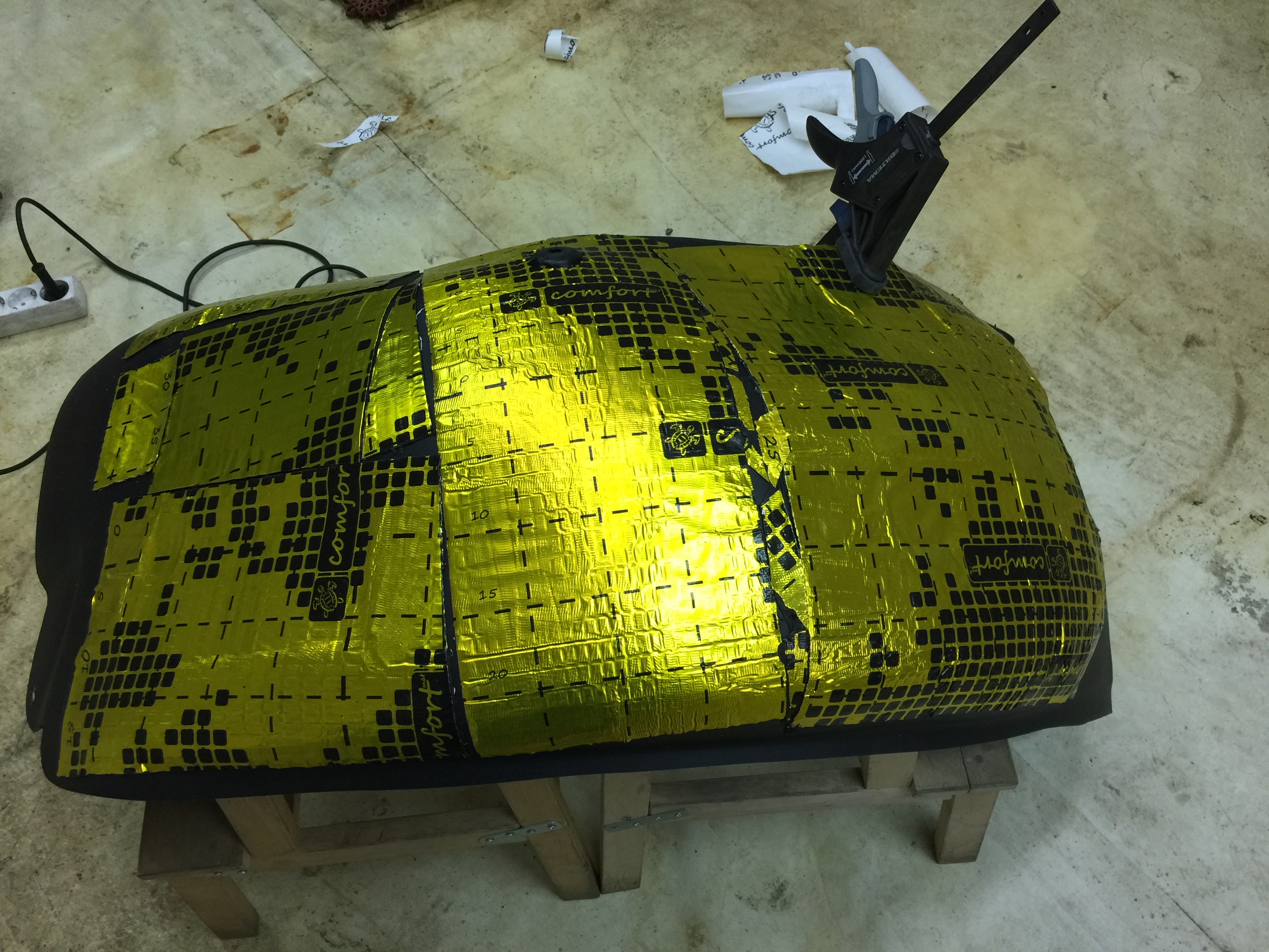 И вот тут я, Ёлы-палы, вспоминаю, что клеить её собирался на металл. Но делать нечего, так и продолжил с остальными. Лист лучше разрезать на части, кому, какими удобно работать. Здесь важно, чтобы материал был полностью приклеен, без воздушных мешков. Для этого прогреваем промышленным феном и прикатываем валиком, и прижимаем рукам (работаем в перчатках, материал горячий), но и швами злоупотреблять не стоит.