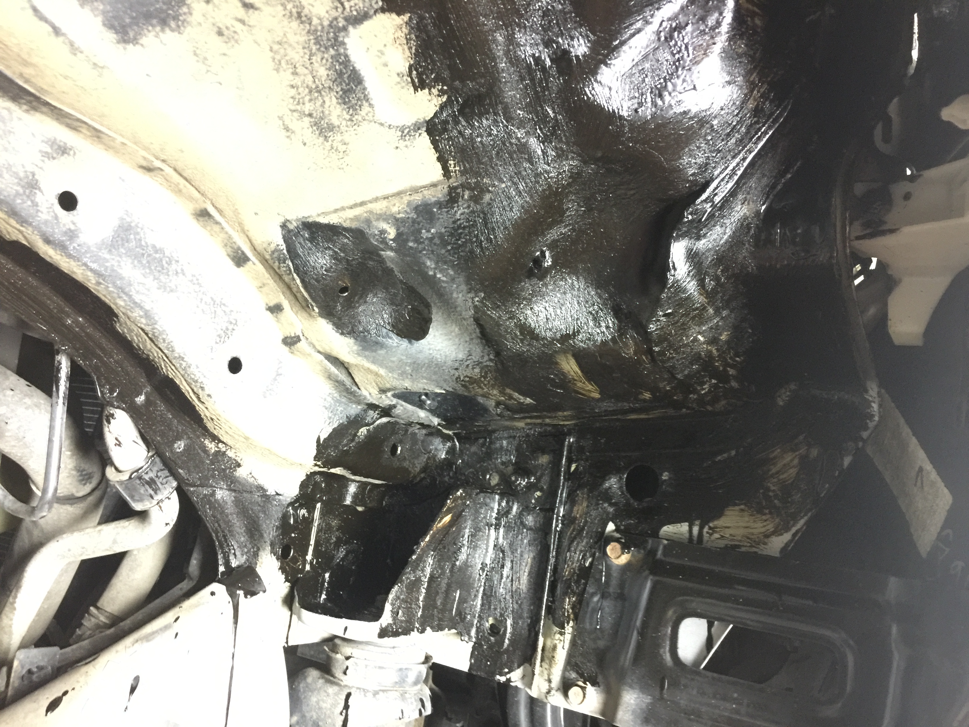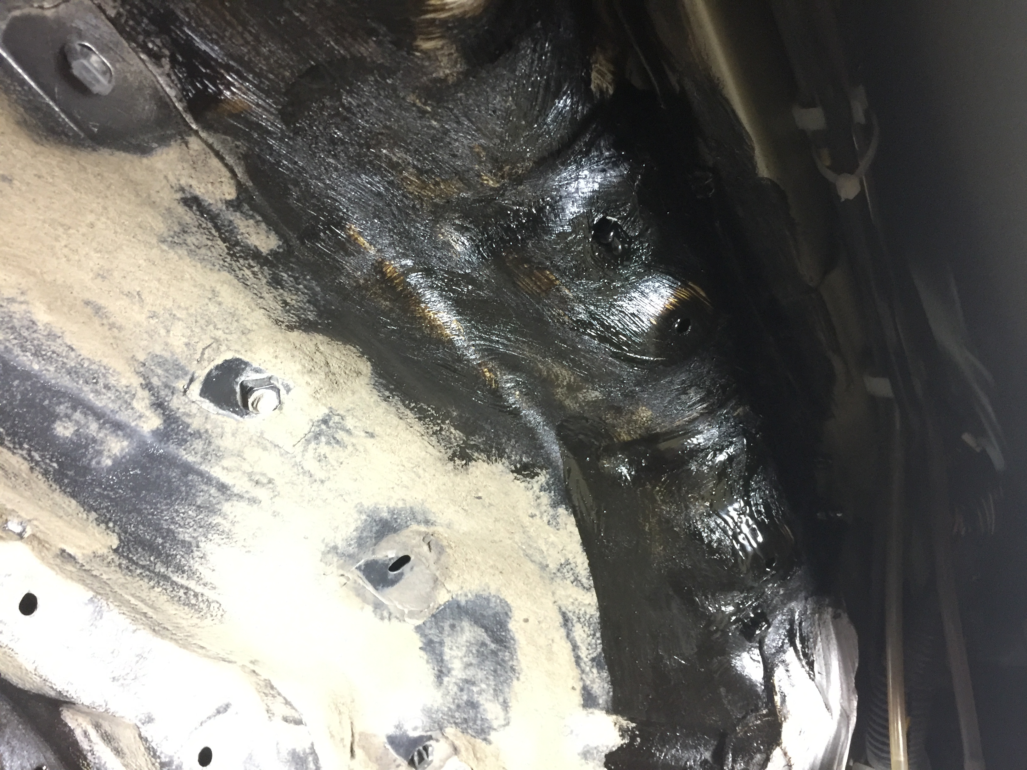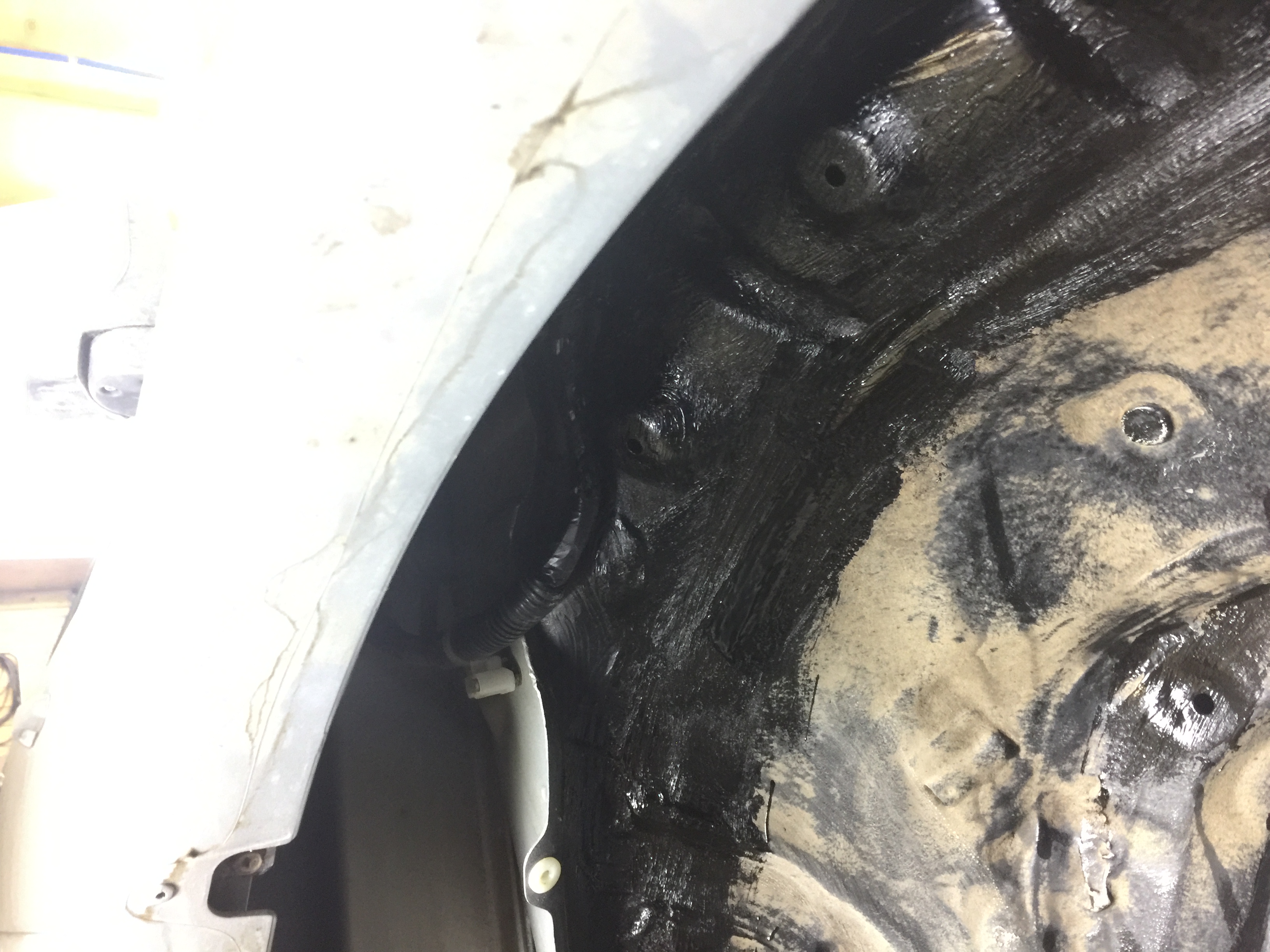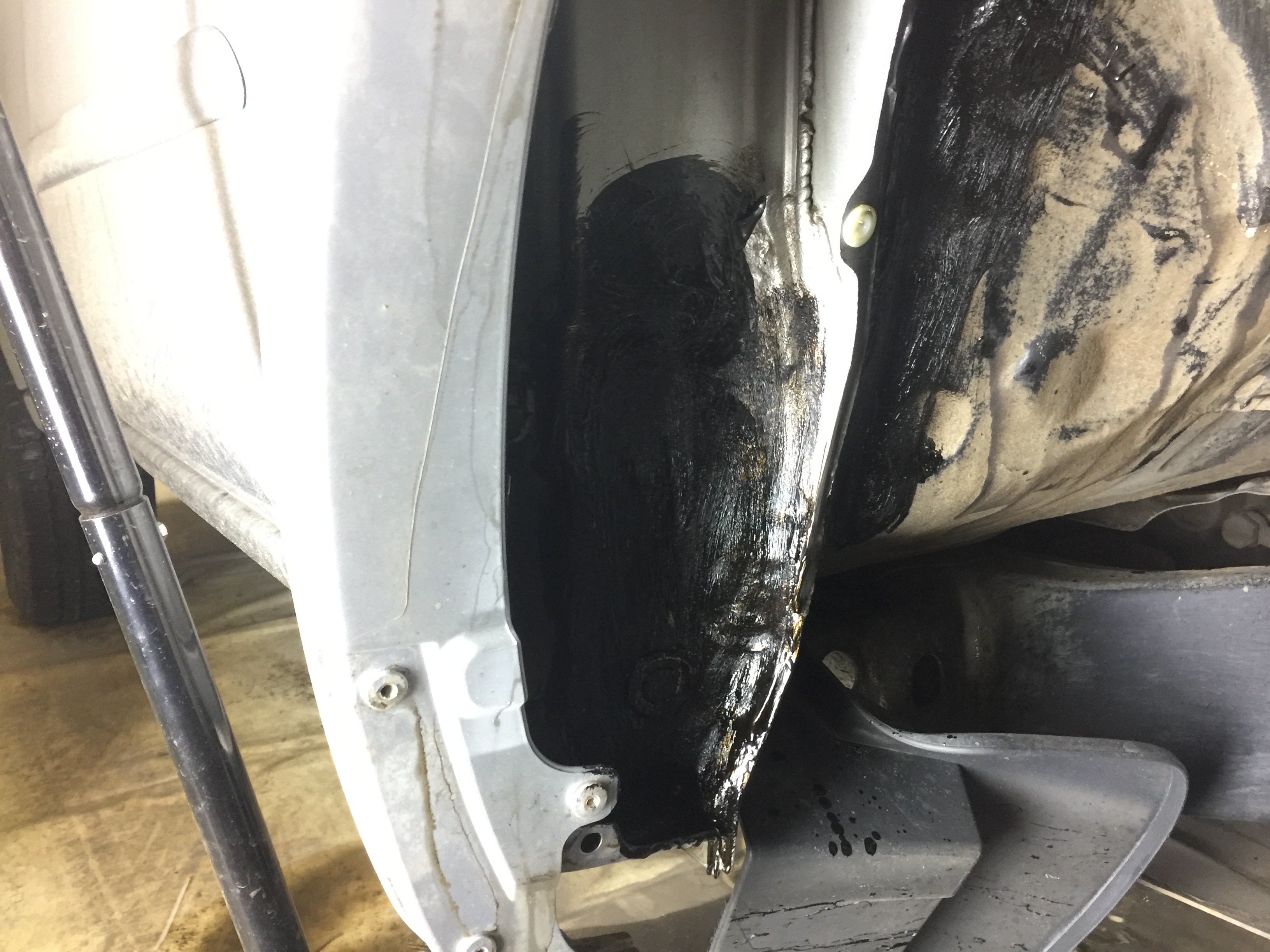 Осмотрев штатный антикор и слой грязи на нем, и убедившись в целостности заводской обработки. Было принято решение обмазать не обработанную поверхность, что открылась нам под штатными локерами и локальный износ в зоне примыкания штатных локеров. Для этих целей сварена давно "нано жижа" из компонентов Пущ сало, резинобитумная мастика, мовиль, ну и всякая еще штука. Когда она холодная, консистенция такая восковая, поэтому наносится в горячем виде кистью.