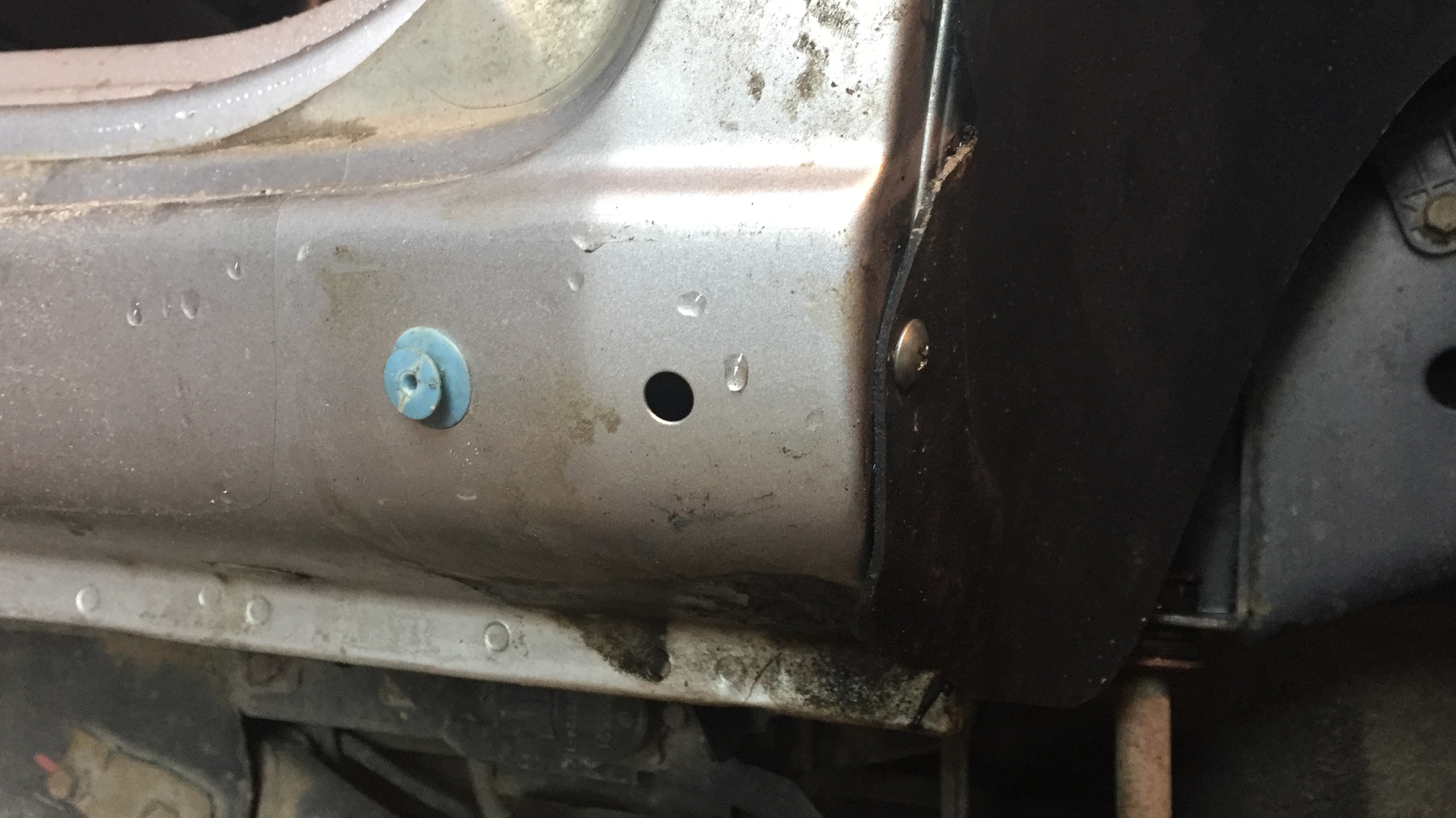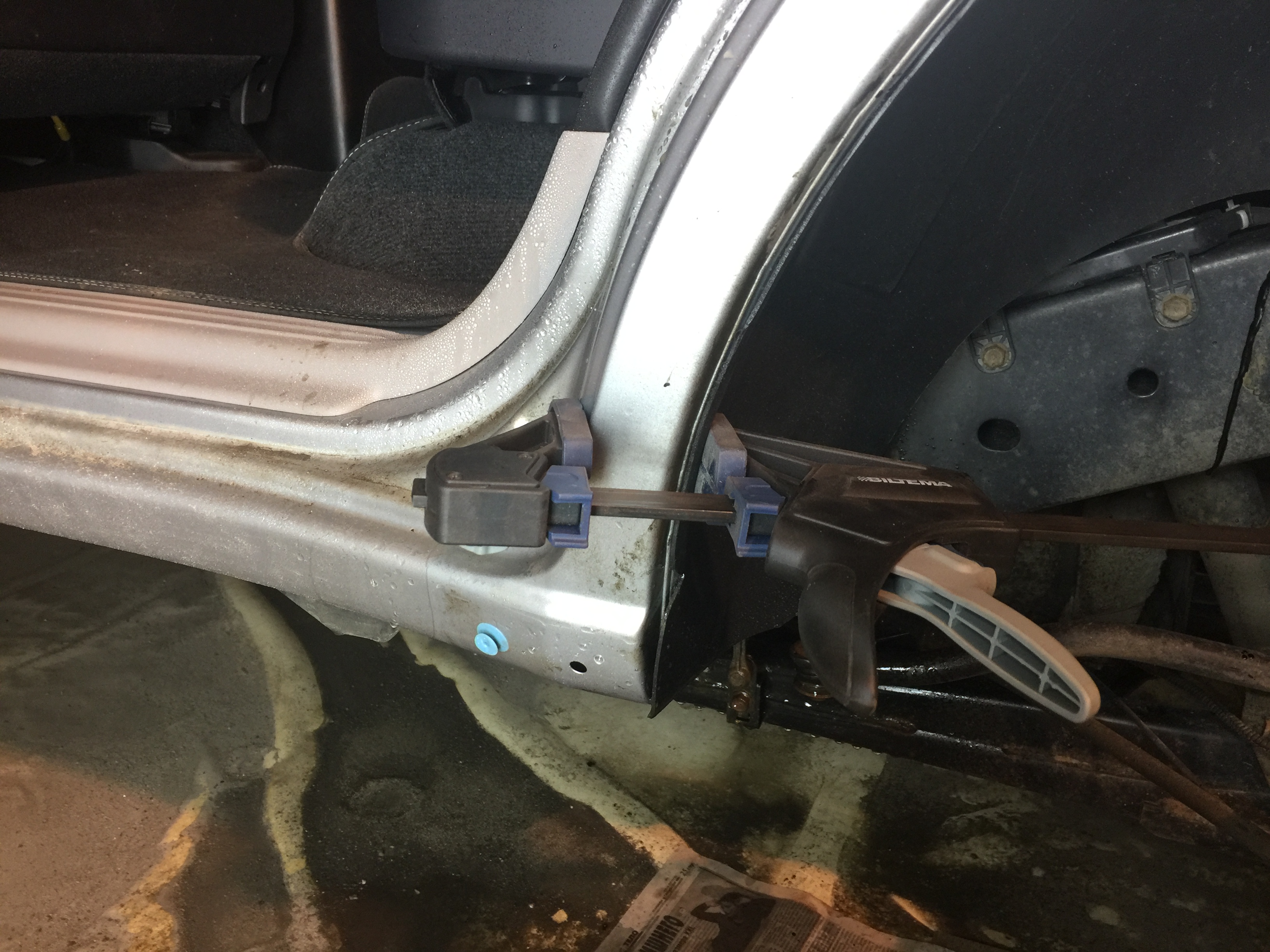 Забегая вперед, скажу, геометрия у локеров очень плохая, одним словом "кооператив", плюс конечно шумка добавила проблем с установкой. На расширители, куда ложится наружная часть, был наклеен двусторонний скотч. Защитную бумагу со стороны прилегания локера не снимал. Это сделано для того, чтобы он не натирал пластик. Начал я с установки правого переднего локера. Позанимавшись сексом с ним, я перешел к левому. Благополучно провозившись еще энное кол-во времени и, сломав пистоны, я ретировался на рынок за крепежом. Зачем то его продублировал. На следующий день призвал жену на подмогу. Еще раз по сексовав, окончательно убедившись в проблеме с крепежом, было принято решение просверлить на сквозь штатные отверстия и поставить болты. Сказано сделано, все обработано антикором.