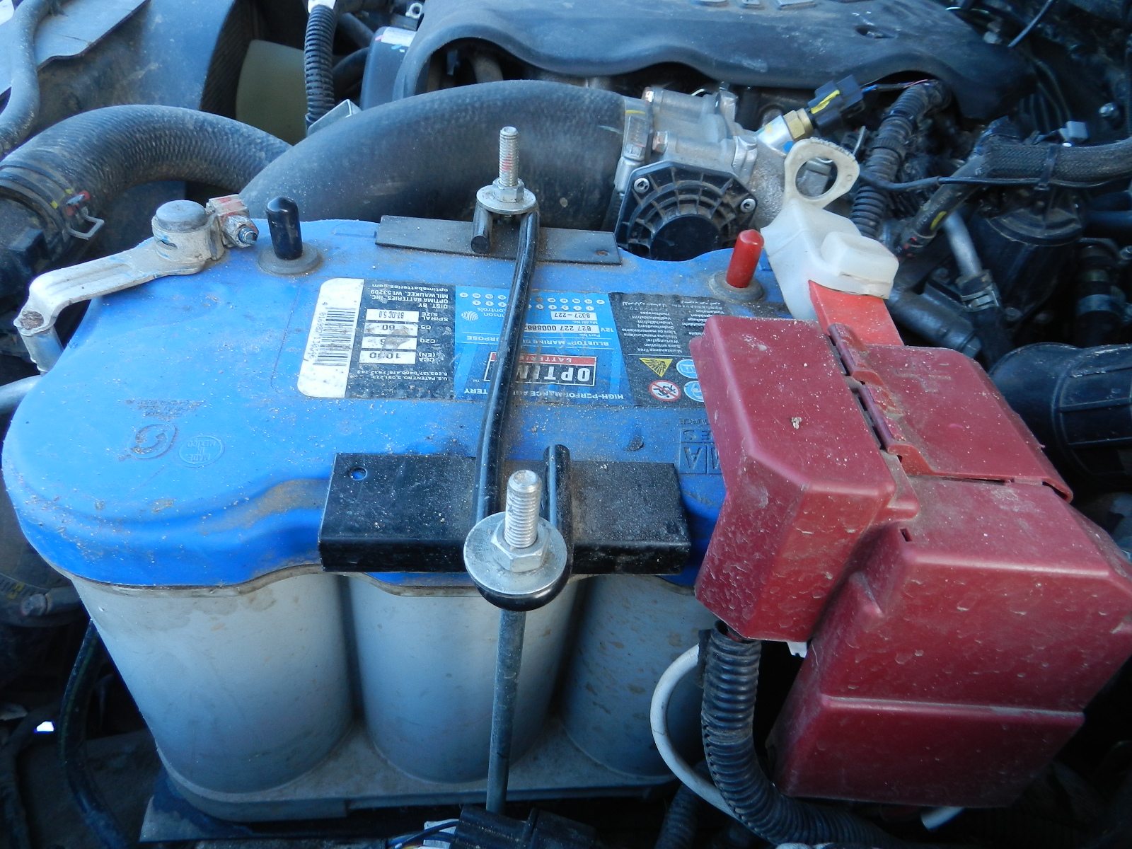 Аккумуляторы 66 Ач Optima Bluetop (ВTDC- 5,0) п/п синий. Остались в наследство от двойки. Хотел продать, полярность разная на двойке и ньюхе. Брать по нормальной цене не захотели, да и я не захотел дарить хорошие вещи. Итог: Прямая полярность в место обратной. Правый просто так не встанет надо корыто подпилить. Левому надо шину наростить. Длины родных проводов хватает.