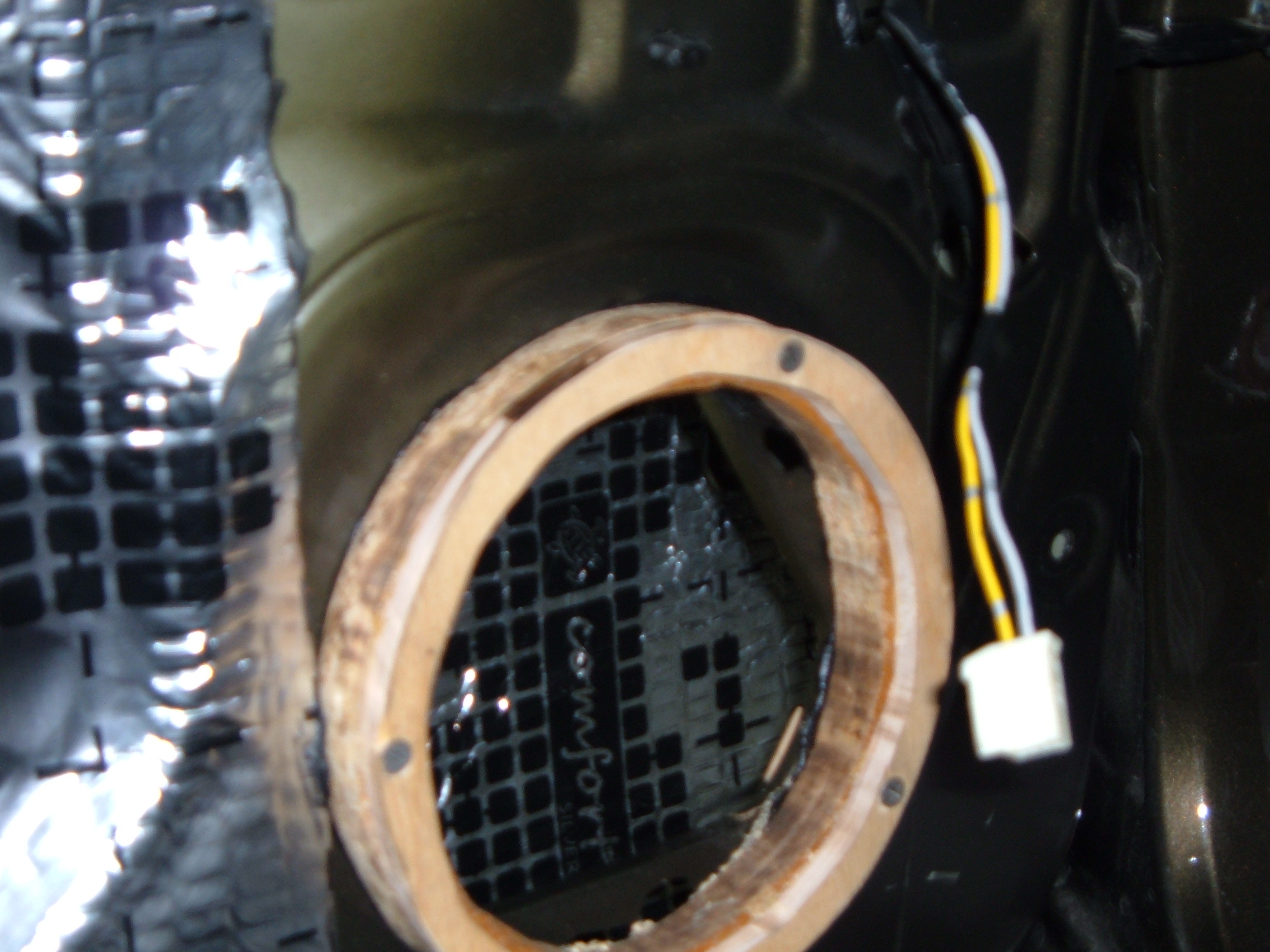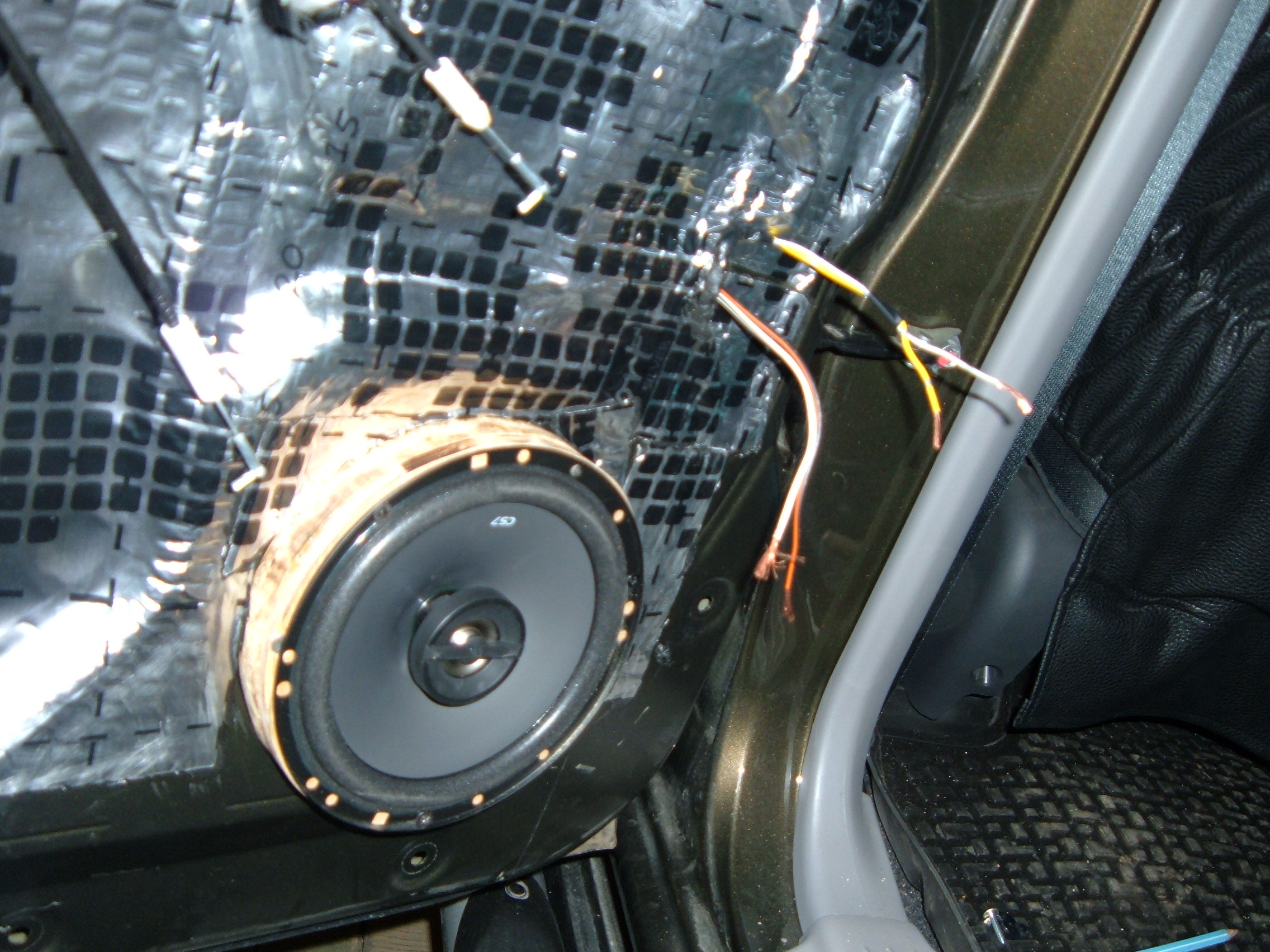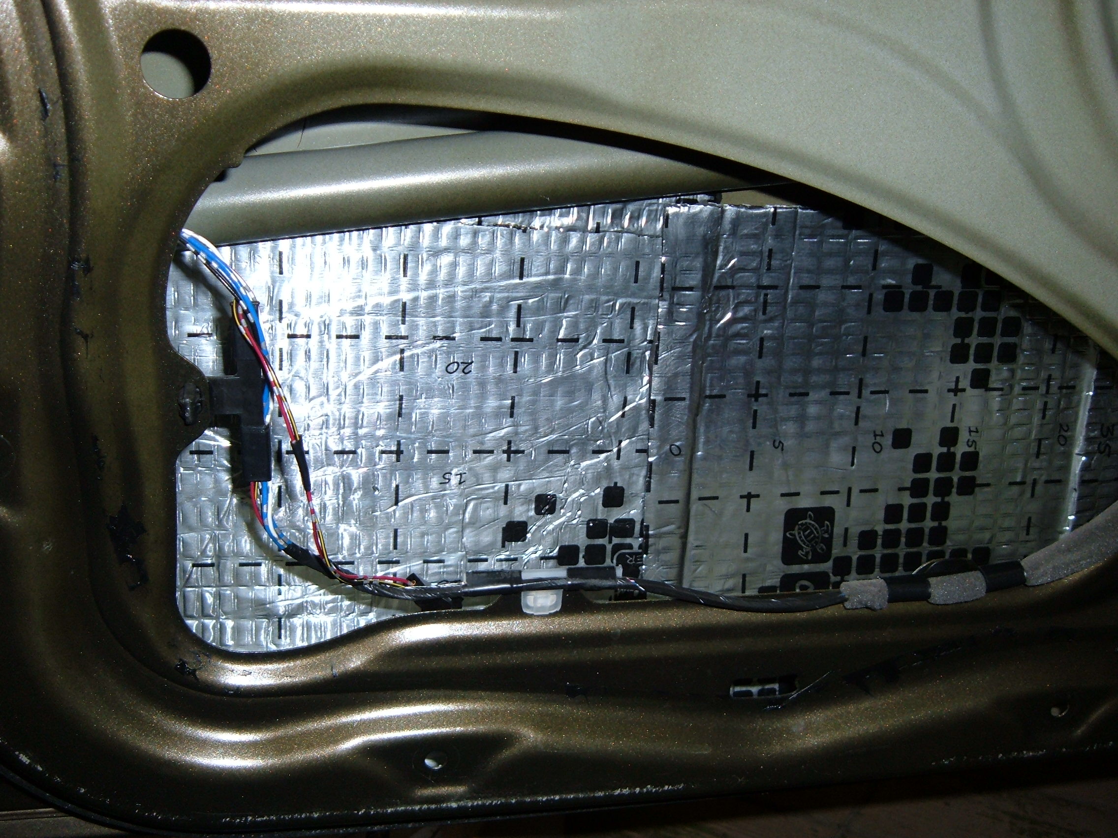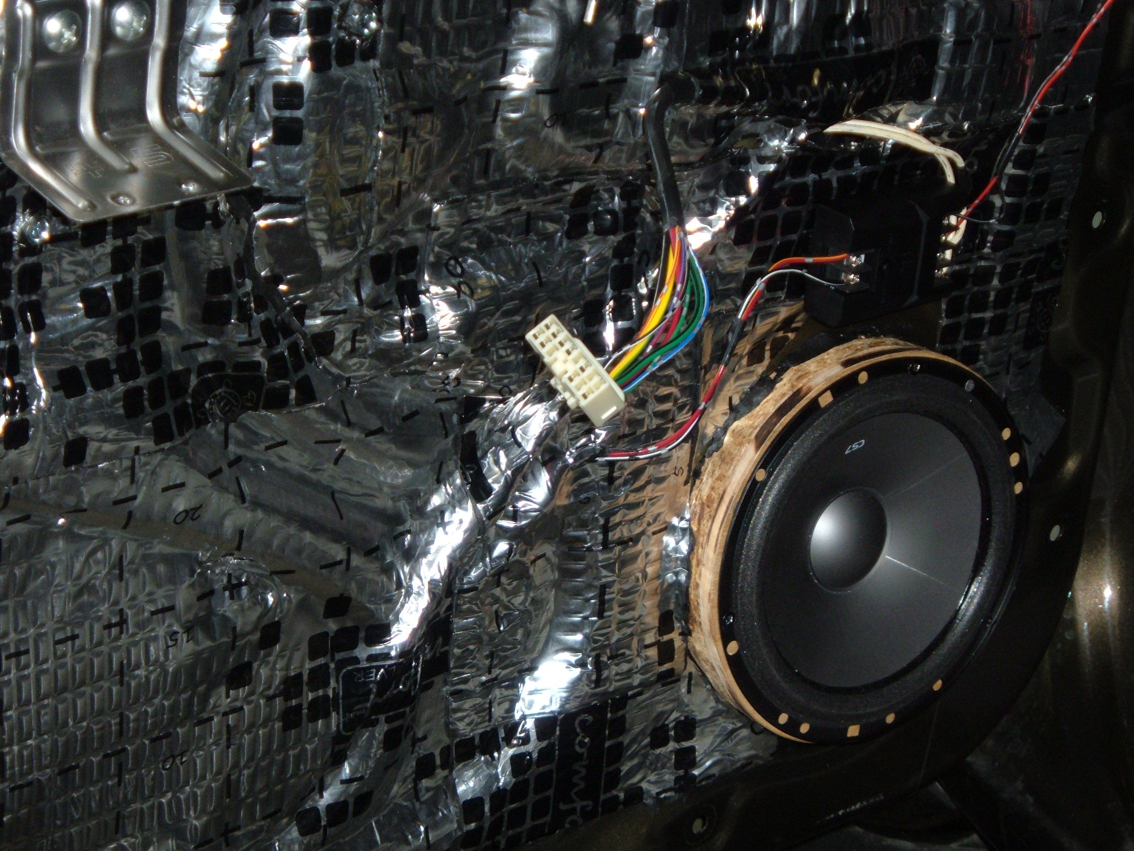 Сегодня, с обеда, выкроив время, решил продолжить начатое накануне, а именно, заменить акустику и довести акустику самой задней двери до ума. Учитывая вчерашний опыт, дело пошло споро, несколько меньшая площадь задней двери, и коаксиальная, вместо передней компанентной акустика, подсказывали, что с работой управлюсь несколько быстрей вчерашнего, и так в общем то оно и было, но вот когда почти на финише, осталось только расключить провода, то обнаружил, что провода подходящие к динамикам, в отличии от передней двери (красный и чёрный), имеют совсем иную раскраску, желтый и серый, и при всём напряге фантазии, никак не хотели подсказывать, какой из них плюс, а какой минус... так что вчерашняя казалось бы уверенность, сменилась опять полным замешательством. Пока расключил руководствуясь положению проводов в колодке, как на передней двери, хотя совсем не уже не уверен что вчерашнее расключение верное.