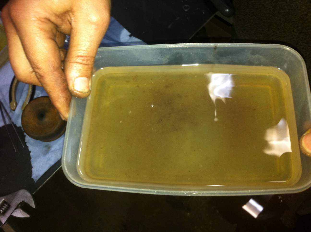 А теперь пара слов про то, что у меня, видимо, в баке находится. Дело в том, что на последней гонке в Крестах у меня загорелся датчик воды в топлевном фильтре, потом погас. Я поехал к дизелистам и поменял фильтр. ТО, что мы слили с фильтра повергло в легкий шок всех присутствующих. И даже бывалого дизелиста, он такого никогда не видел и говорит: " У тебя в баке ржавчина". А я, немного подумав, сказал, что это болотная вода...