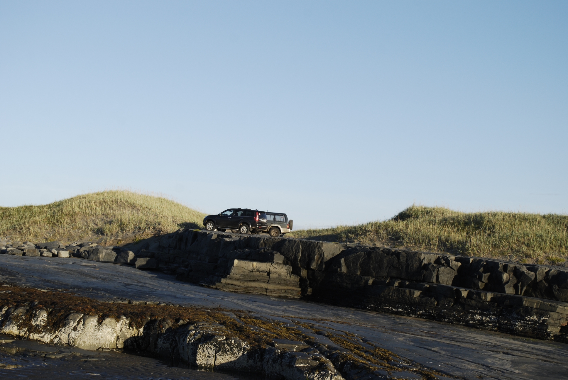 23. Начинаются сумерки. Ищем место для ночевки. Заезжаем на бывшие позиции ПВО, расположенные на вершине. Западная часть полуострова как на ладони. Окинув зорким взглядом местность, находим неплохое место, защищенное от ветра кустами и многообещающим видом.