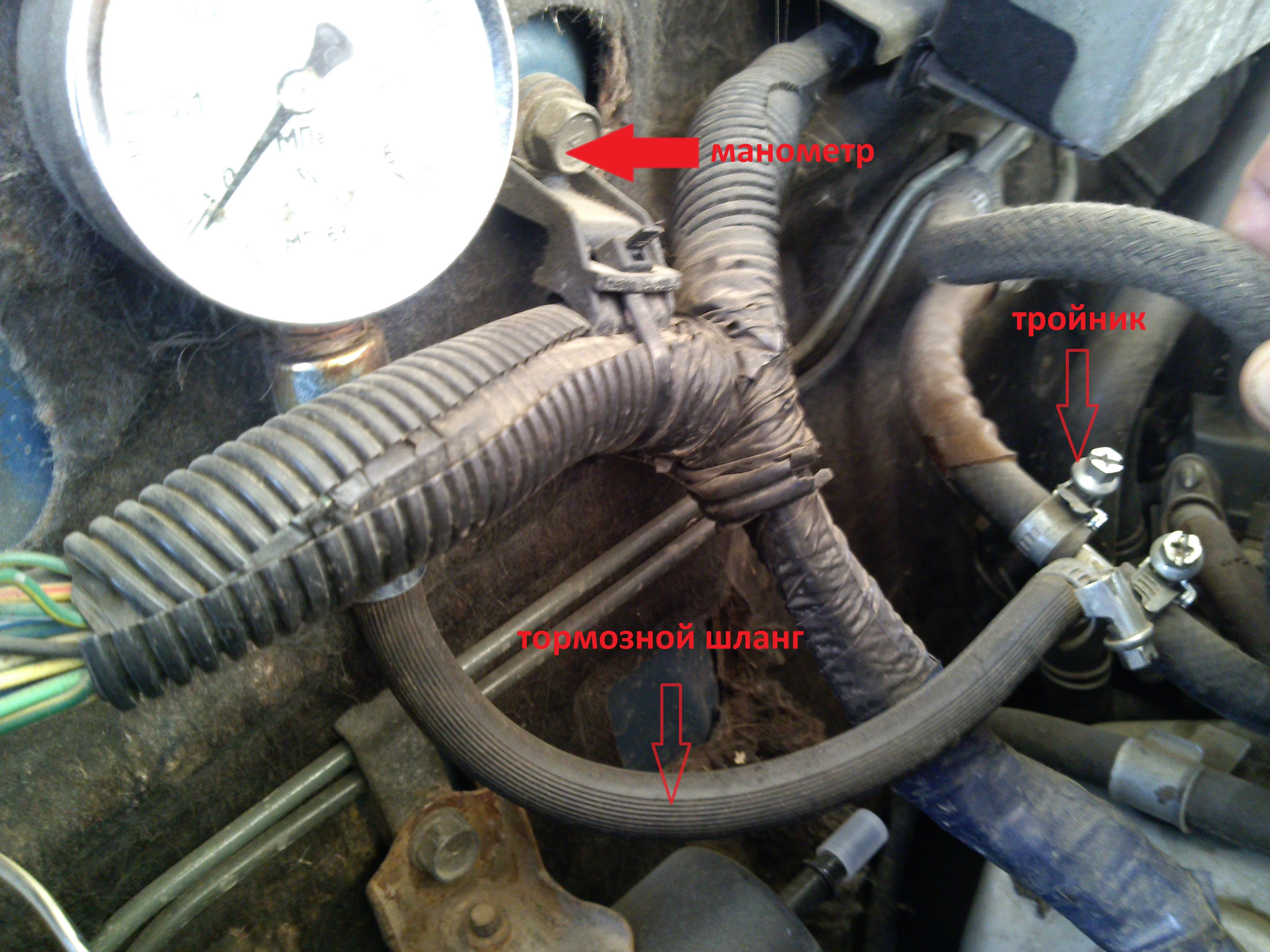 Как обещал фотка. Правда с опозданием. Врезал в подачу. Тормозной шланг подбирал по резьбе к манометру, отрезал лишнее и через тройник на хомуты. Немного колхозный вид, но всё работает)))