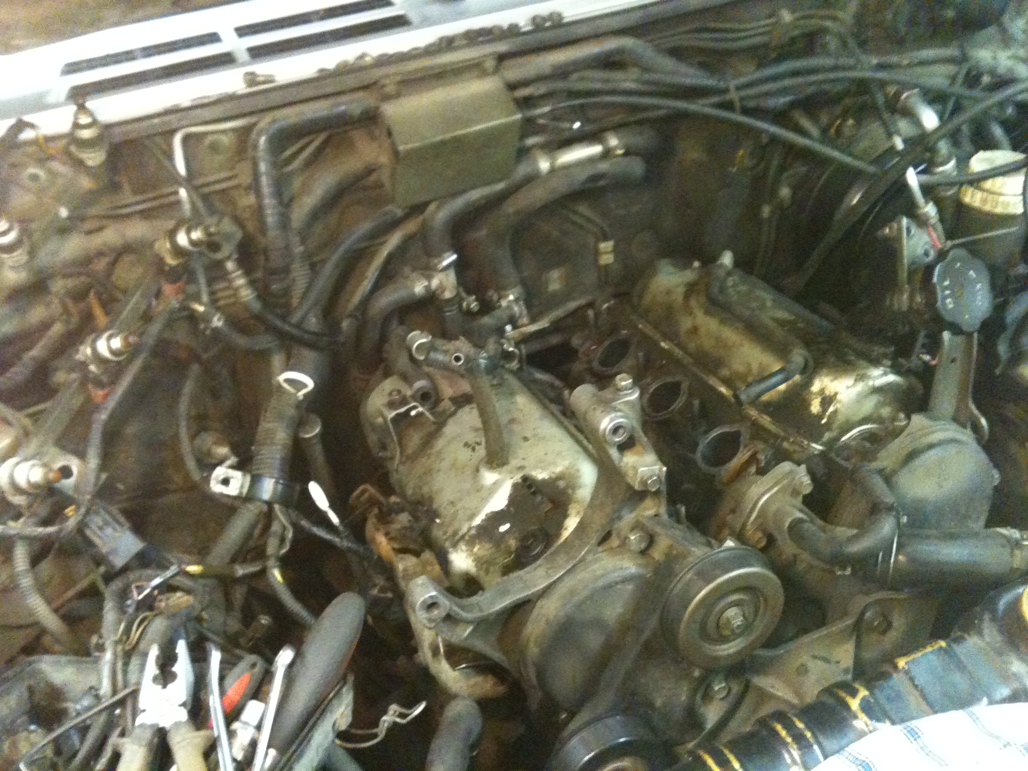 С 22:00 по 01:30 в целом ничего интересного. Снимаем кожух радиатора, сливаем ОЖ, снимаем впуск, трамблер, навесное, ремень ГРМ, клапанные крышки. Всё это делается легко и непринуждённо, а если ещё и вкручивать все винты и гайки туда, откуда они были вывернуты, то и накосячить при сборке практически невозможно. В целом секс имеем только с 4-ремя болтами так или иначе завязанными с системой циркуляции ОЖ. Первое засадное место - тройник, который крепится флянцем к V-образной части впуска на 2-х болтах, и от которого уходят трубки на печки и клапан с термостатом в обходном канале узла дроссельной заслонки. Откручивать удобнее сняв со шпилек часть впускного коллектора, которая устанавливается в развал двигателя. Вторая засада с двумя болтиками поджидает при откручивании от правой ГБЦ кронштейна металлической трубки ОЖ, которая проходит в развале блока прямо в помпу (прямо посередине на фотографии №18, и кронштейн видно с двумя дырочками под болты). Вот там конечно нужно постараться: открутить надо два болта на 12, а на маленькую трещетку у меня были головки только на 11 и 13. Большой трещёткой можно подлезть только чтобы сорвать с места болты (ну хоть на этом спасибо конструкторам мотора), а рожковым ключом орудовать толком негде. В общем, на откручивание только лишь этих 4-рех болтов было потрачено около 1 часа времени (фотографии этапов процесса разбора №2-3).