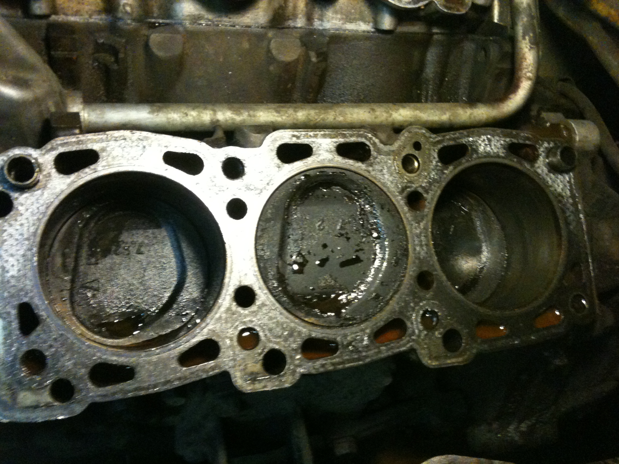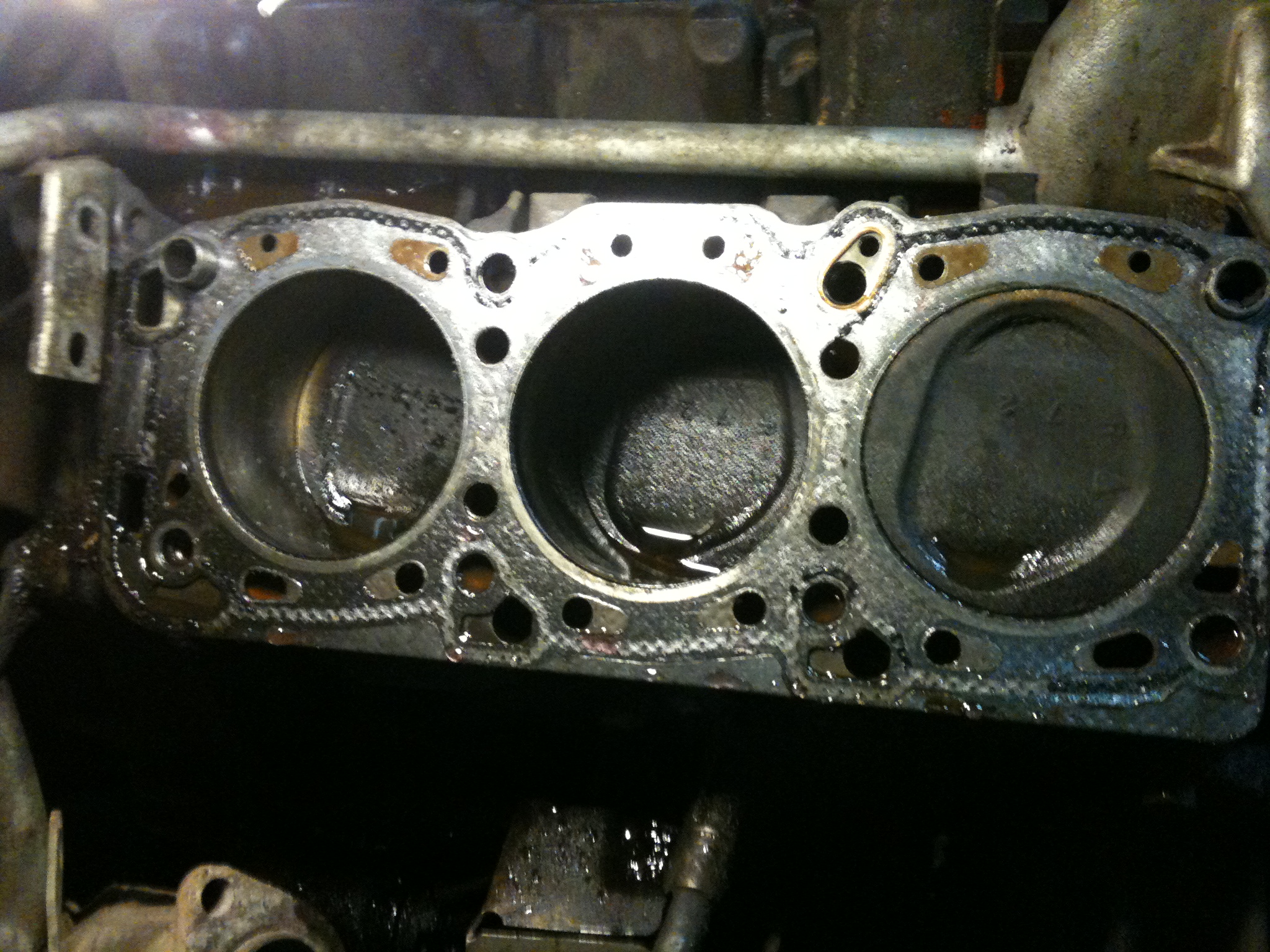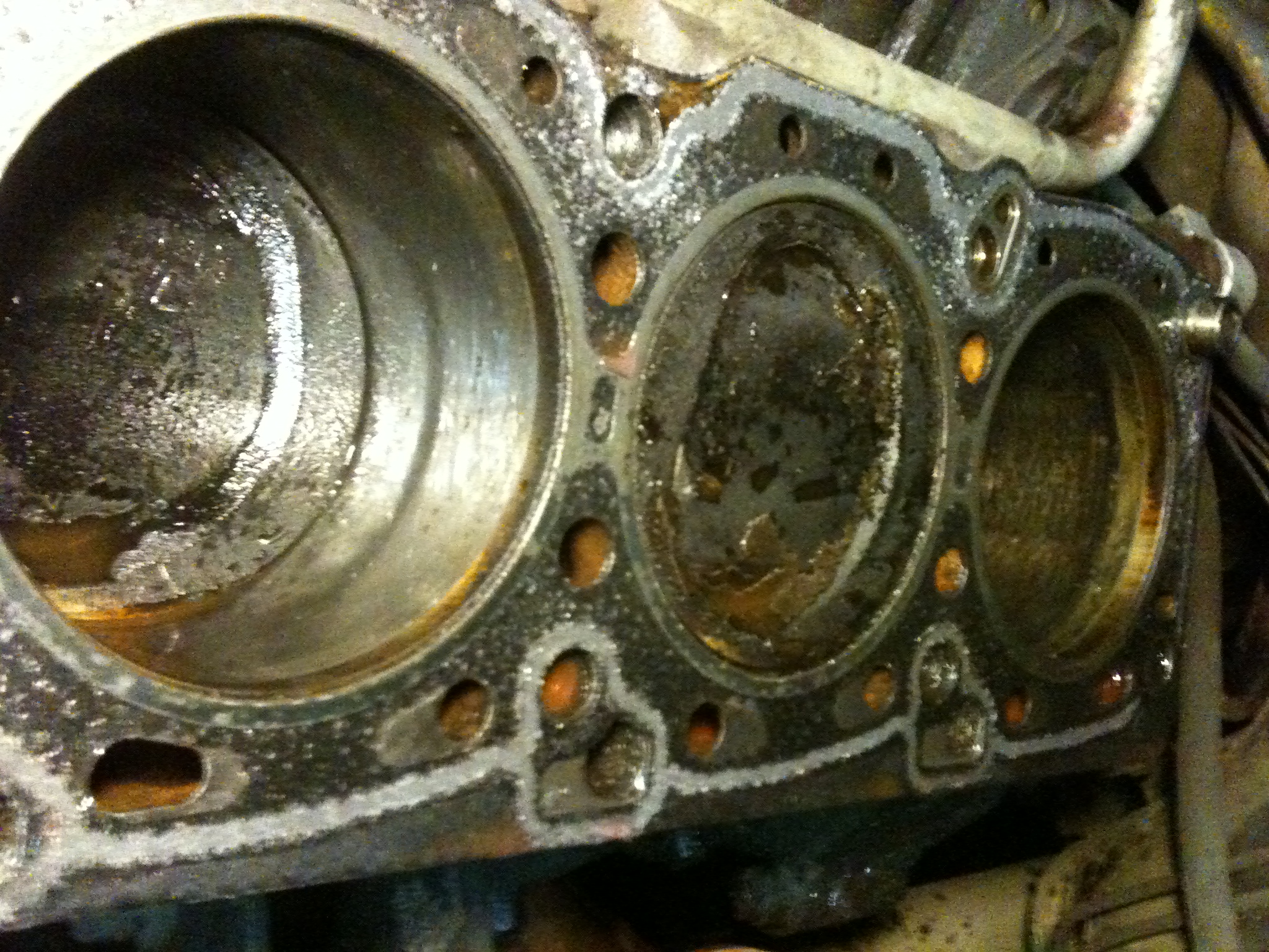 В 02:50 снята левая ГБЦ, изучено состояние прокладки, цилиндров, прошней. Следов пробоя по прокладке не обнаружил, поэтому решил, что все-таки в ГБЦ присутствует трещина (фотографии №8-15).
