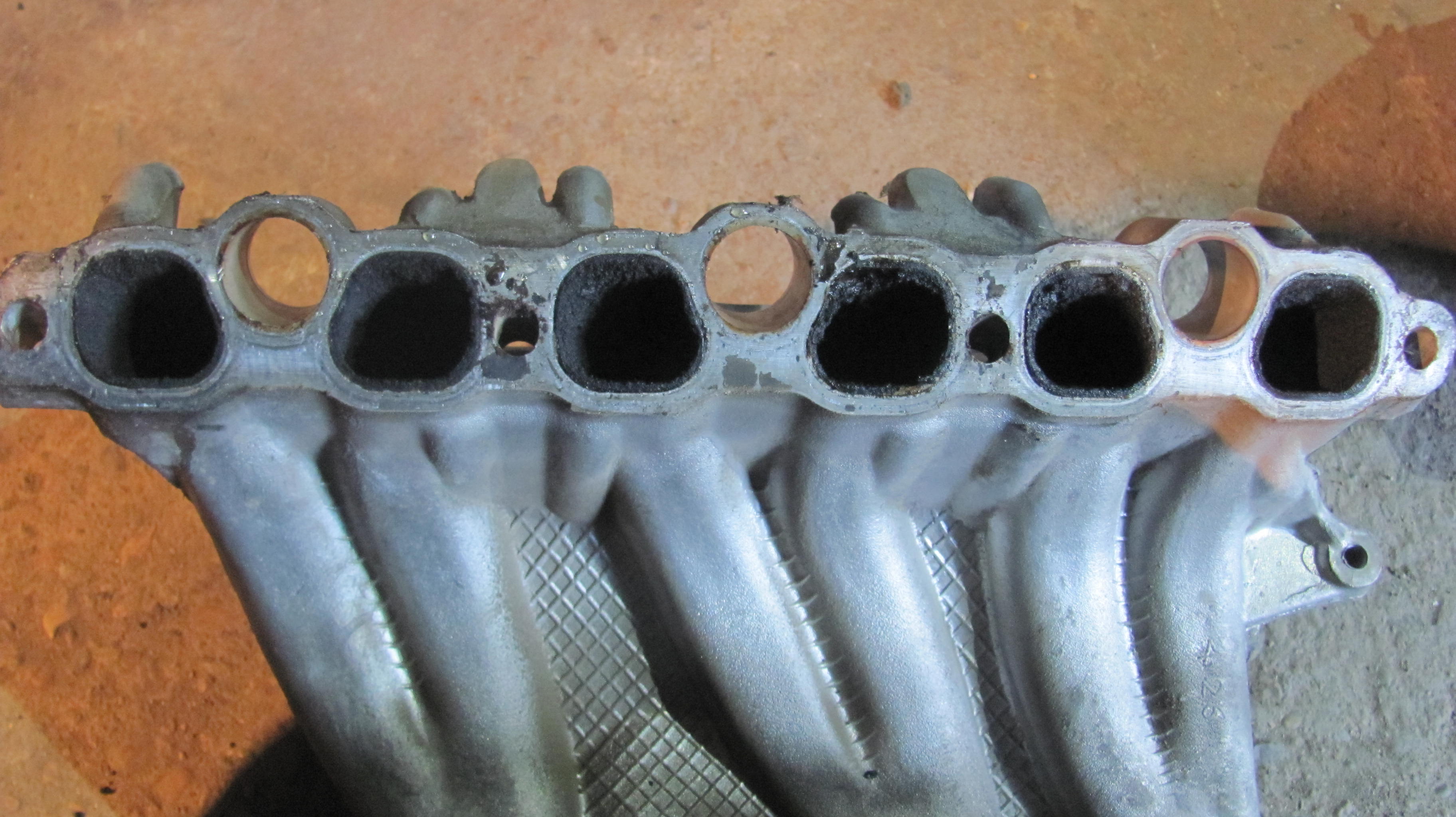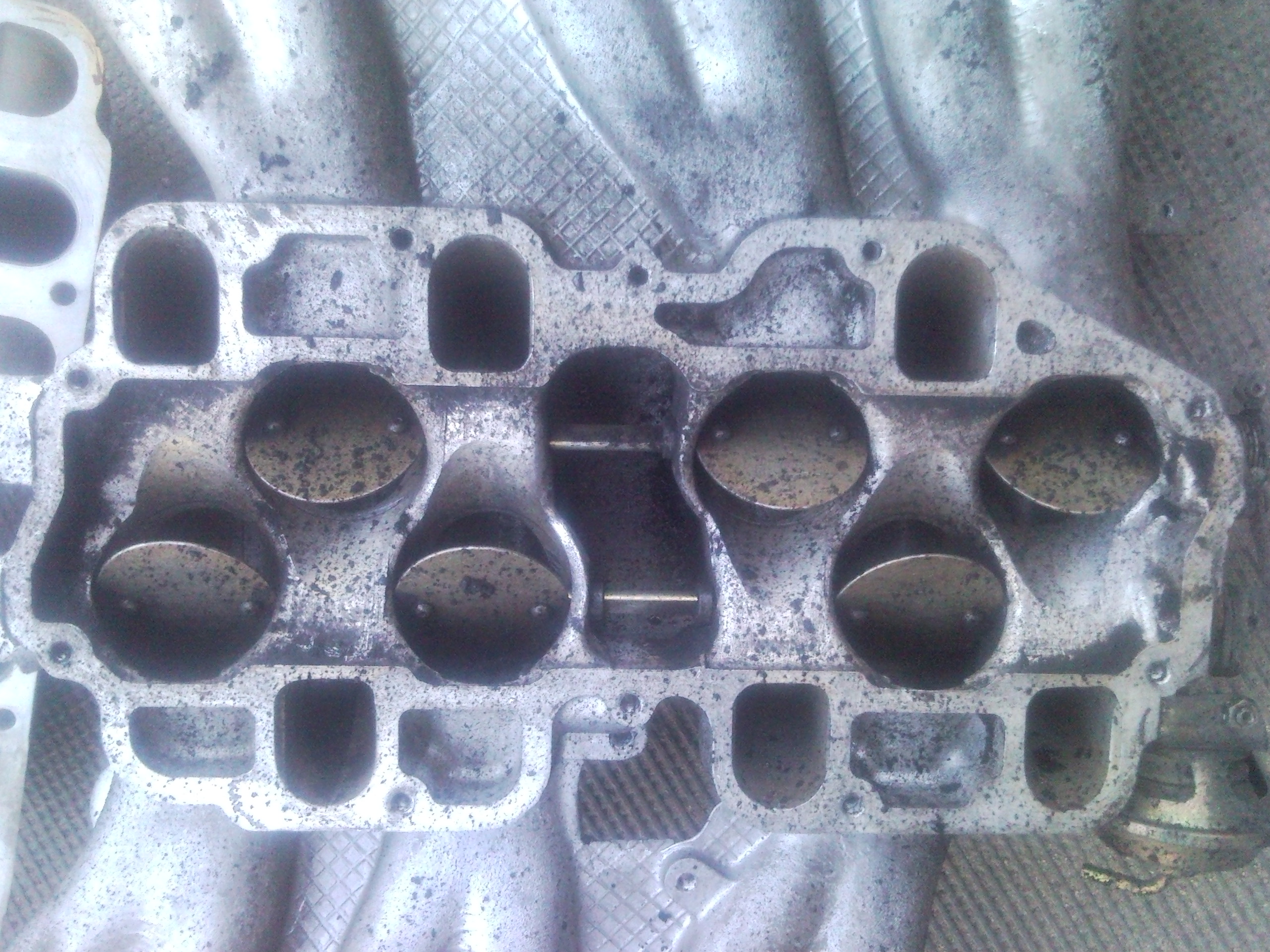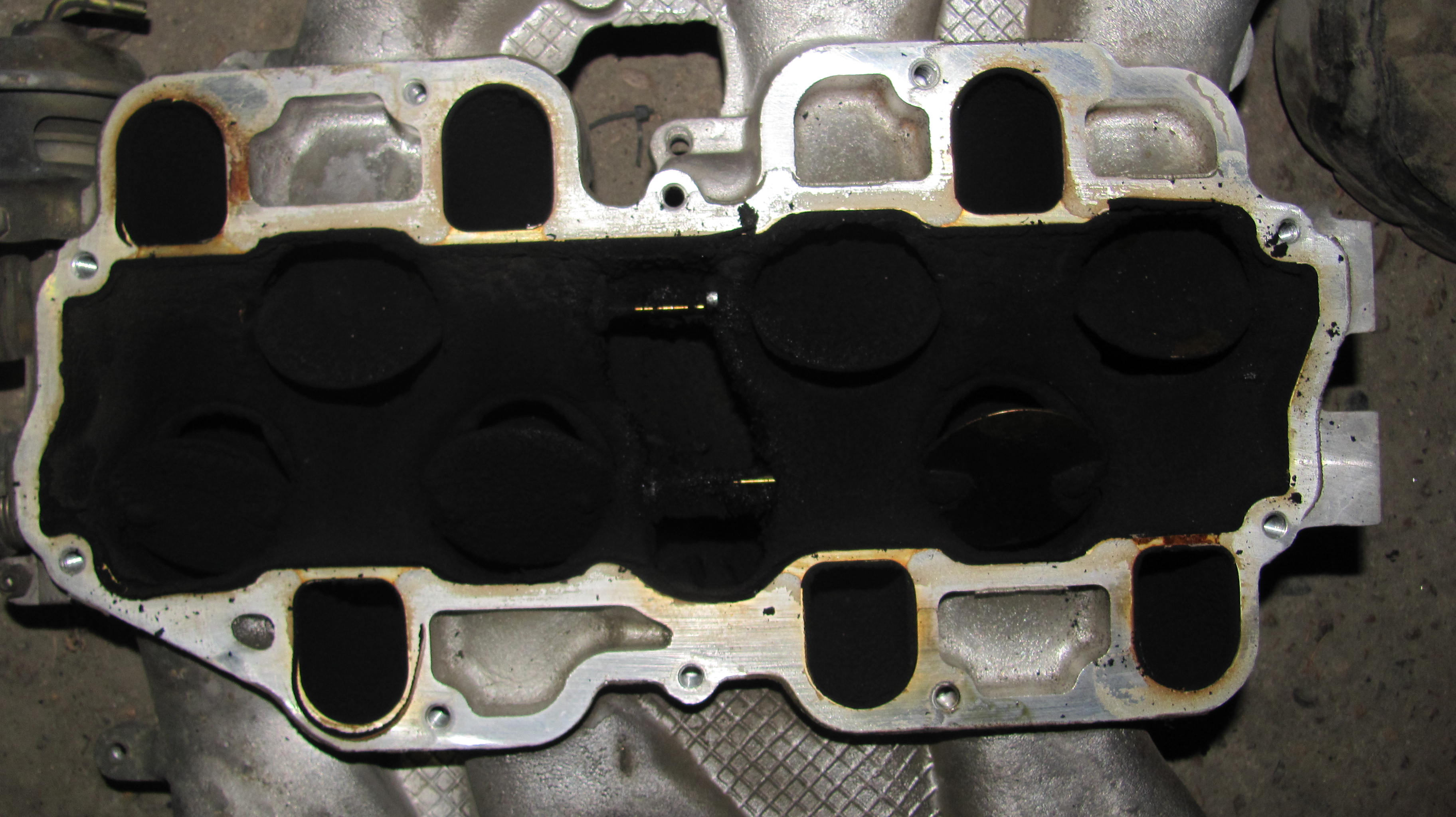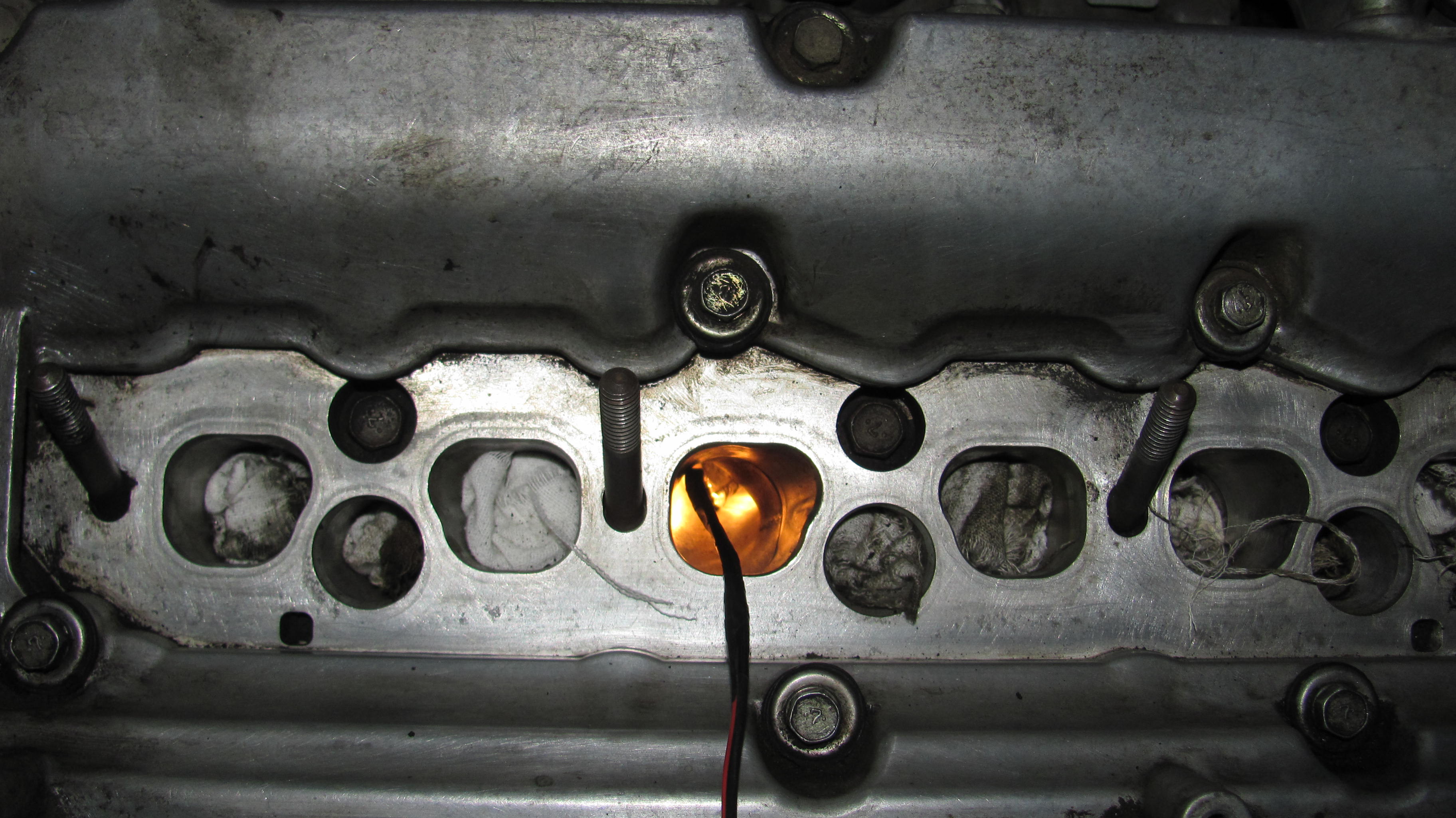 10)хочу открутить и извлечь свечи,но ключ-трубка на 16 отказалась залазить в колодцы.Диаметр наружний составил 24.5мм,обточил на нождаке до 23мм-в правые колодцы влетела как домой,а в левые (что под заслонкой-засранкой)отказалась,войдя на глубину коллектора,глянув в колодец обнаружил несоосность между головой и коллектором.Бросаю эту затею,откручиваю 8 болтов,что держат коллектор,снимаю его-