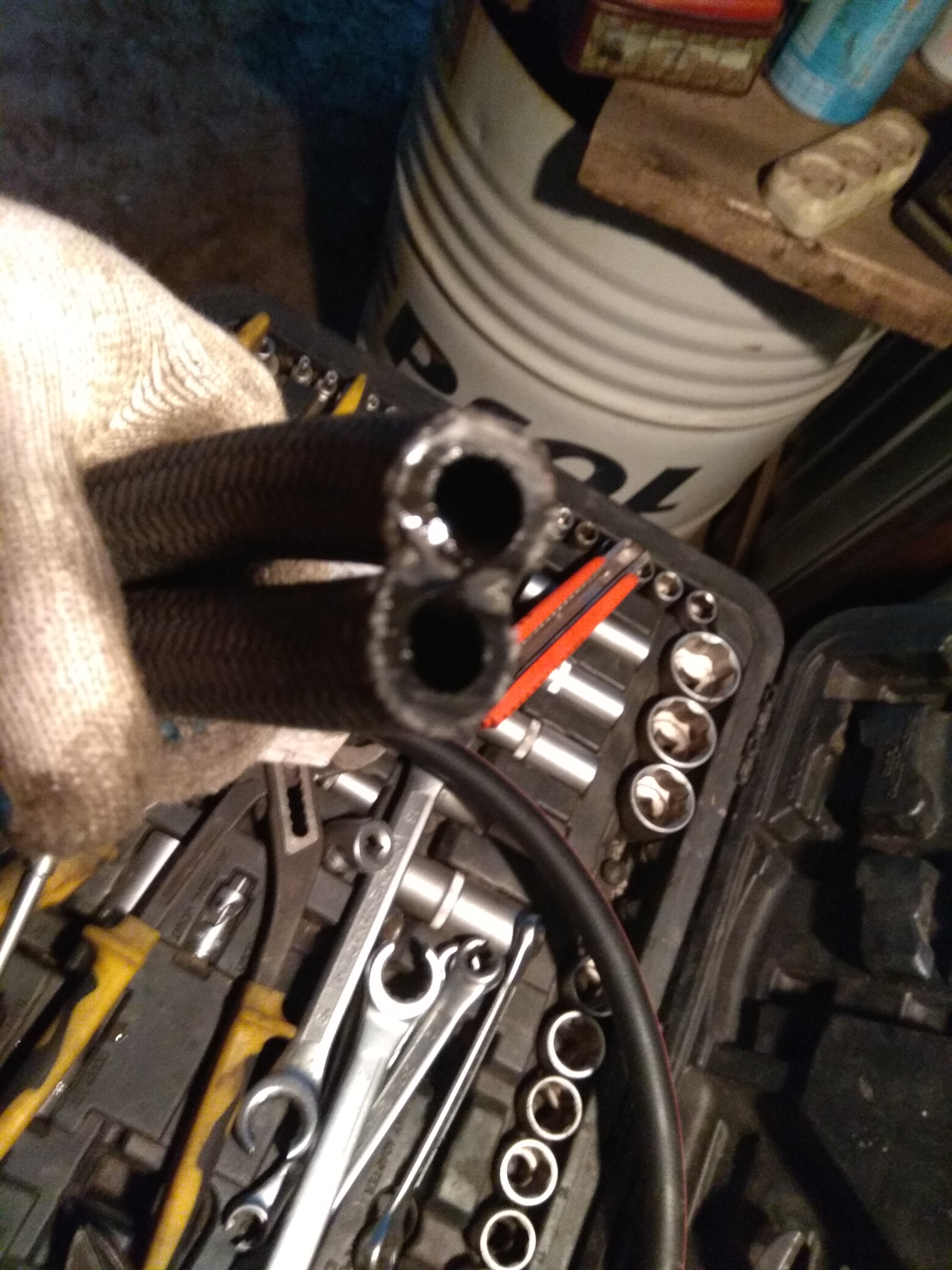 Болгаркой срезал зажимы крепления шлангов к концевикам.
