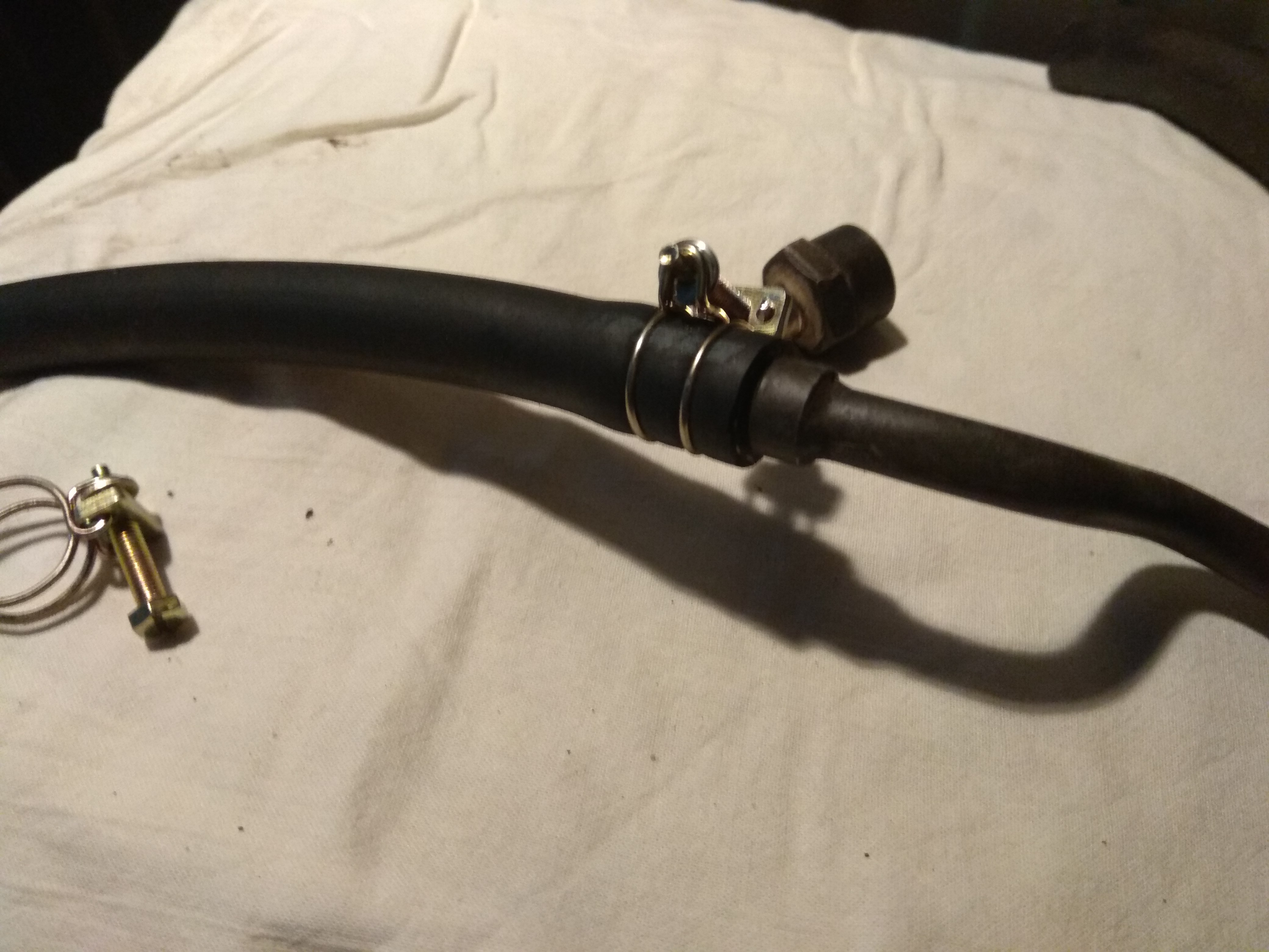 Потом одел защитный патрубок на новый шланг (одевать обязательно, он сделан для защиты от разбрызгивания горячего масла, и попадания его на выпускной коллектор, т.к. сразу загорится), далее одел второй хомут и натянул конец шланга на концевик, и затянул его двух ручейковым хомутом.