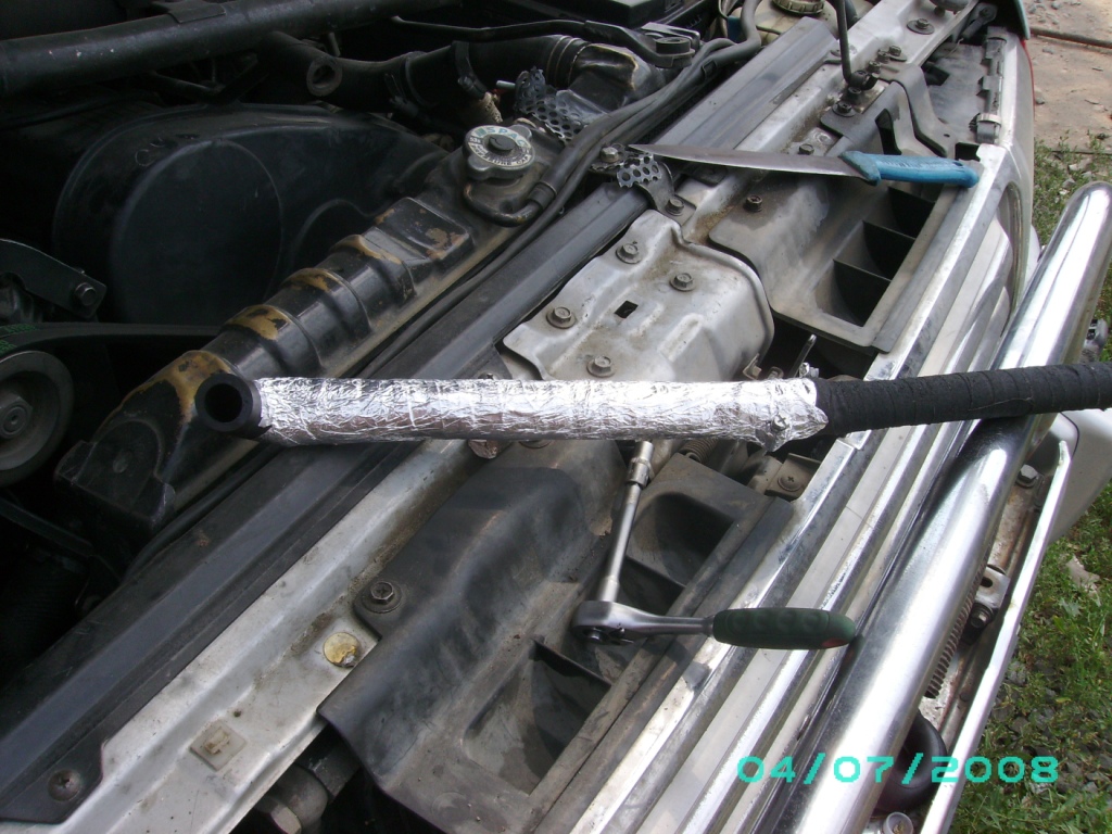 Пятое: шланг слива масла в поддон собрал из шланга сапуна классики и (неправильно!) шланга печки от той же классики. Очень уж у него "гнутость" подходила. Но этот зараза не маслобензостойкий. Да еще вблизи выпускного коллектора. В общем, растрескался и порвался. Сейчас поставил опять-таки собранный из 2-х, но шлангов сапуна от 405 движка. Для термоизоляции обмотал их "тряпочной" изолентой (не полмню, как она называется), а верхнюю часть еще сверху фольгой.