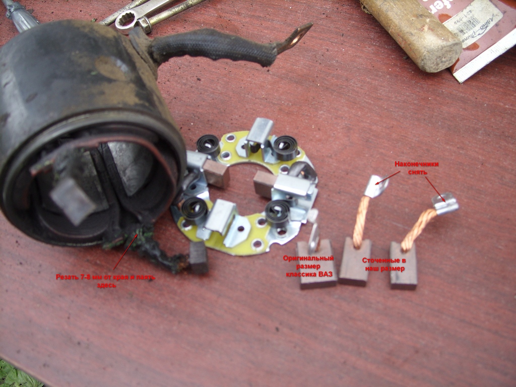 Снимаем клеммы аккума(2-х), снимаем защиту ( что под коробкой) , стартер крепится на 2-х болтах , верхний находится под щупом коробки масляным-его надо снять, снять фишку втягивающего и гайку силового кабеля. Разбор стартера описан в талмутах со схемами. Времени весь разбирать не было (механика вроде в норме), я раскрутил со стороны щеток. Нюанс – внутри стартера ротор опирается на шарик, его не надо потерять. Щетки сточились наглухо , в щеточном узле творился {CENSORED} какойто – смазка налампампам с графитом. В принципе можно все отмыть и обойтись 60рублями денег на 4 щетки. По крайней мере предидущий ремонт был такой . рпавда щетки не пиленые , а были в размер. Откусывают провода к щеткам на гдето на 6-8 мм и туда паяют. При пайке не сильно увлекаться , дабы не залудить провод к щетке сильно выше пайки.