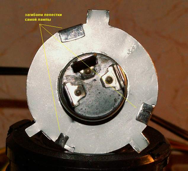 Нужно один раз вырезать два переходника, по форме как цоколь лампы Н4 и использовать их постоянно, не сгибая и не разгибая. А гнуть лепестки лампы, ибо она работает один раз.