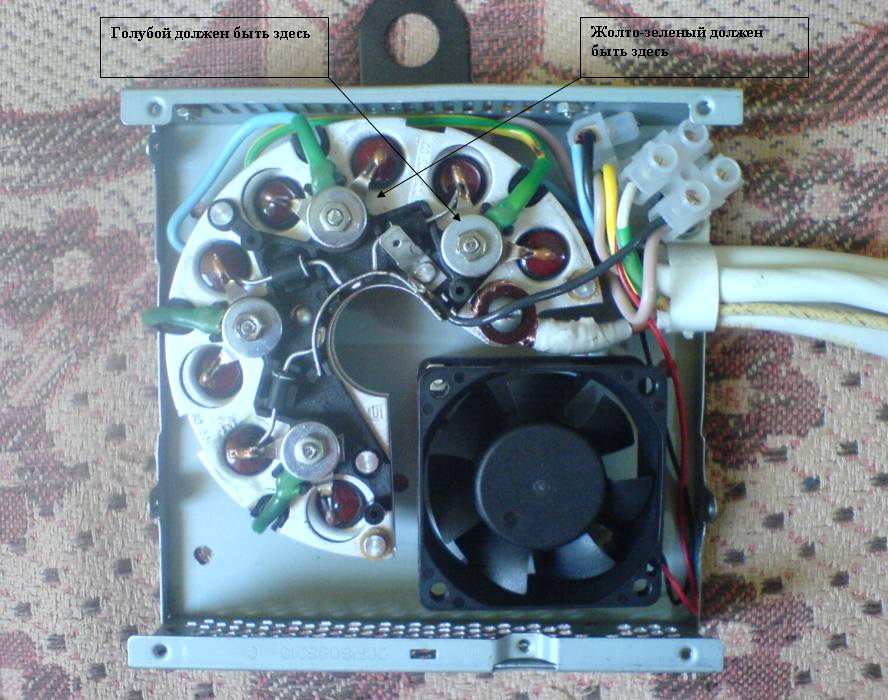 Теперь откручиваем реле со щёточным узлом. Меняем щётки но не припаиваем их к старым контактам (или припаиваем но выковыриваем старое реле, варианты предлагать), а припаиваем к проводам (просунутым сзади) которые были для этого приготовлены в общем пучке проводов идущих к нашему выносному блоку с диодным мостом. Аккуратно собираем щёточный узел и прикручиваем на место. Тем кто хочет оставить старое реле но подстраховаться щетки соединяем по такой схеме
