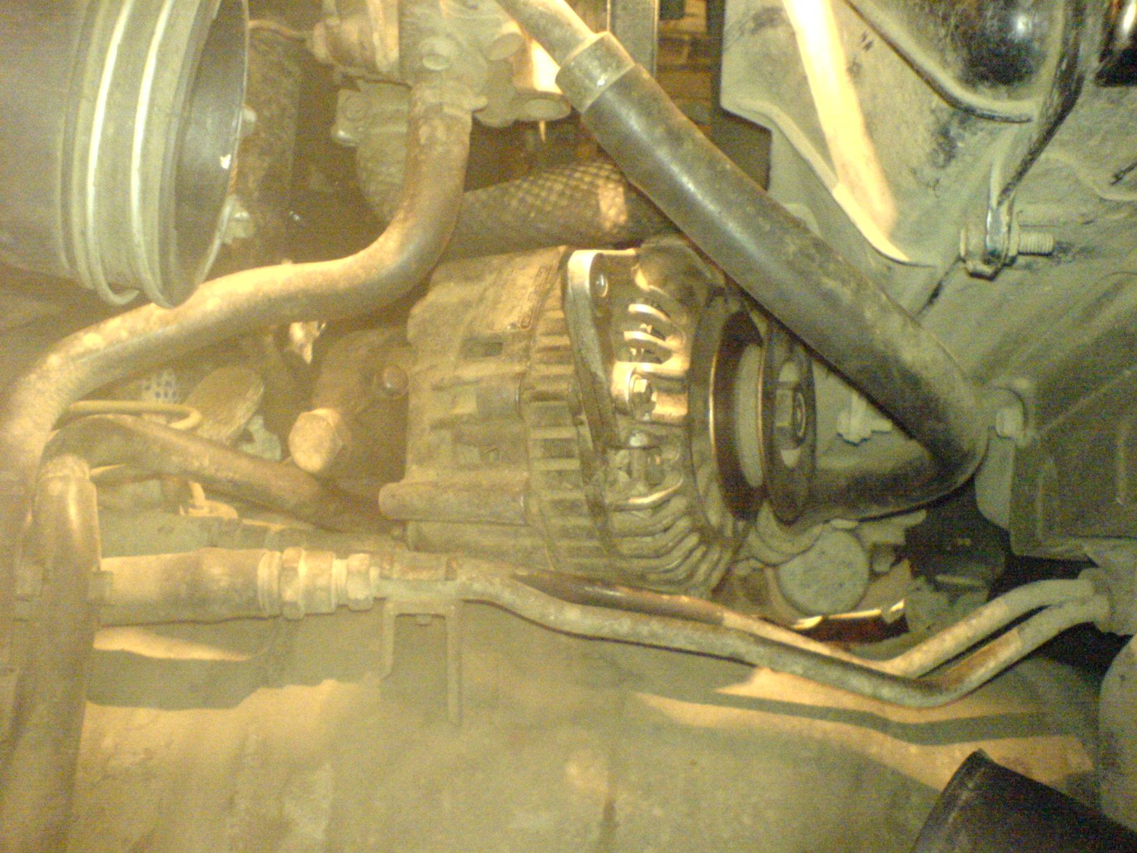 Снимаем генератор. Кто-то говорил что его без откручивания маслофильтра вынуть не возможно. У меня получилось. Пригибаем шланги от радиатора. И с трудом он пролазит.