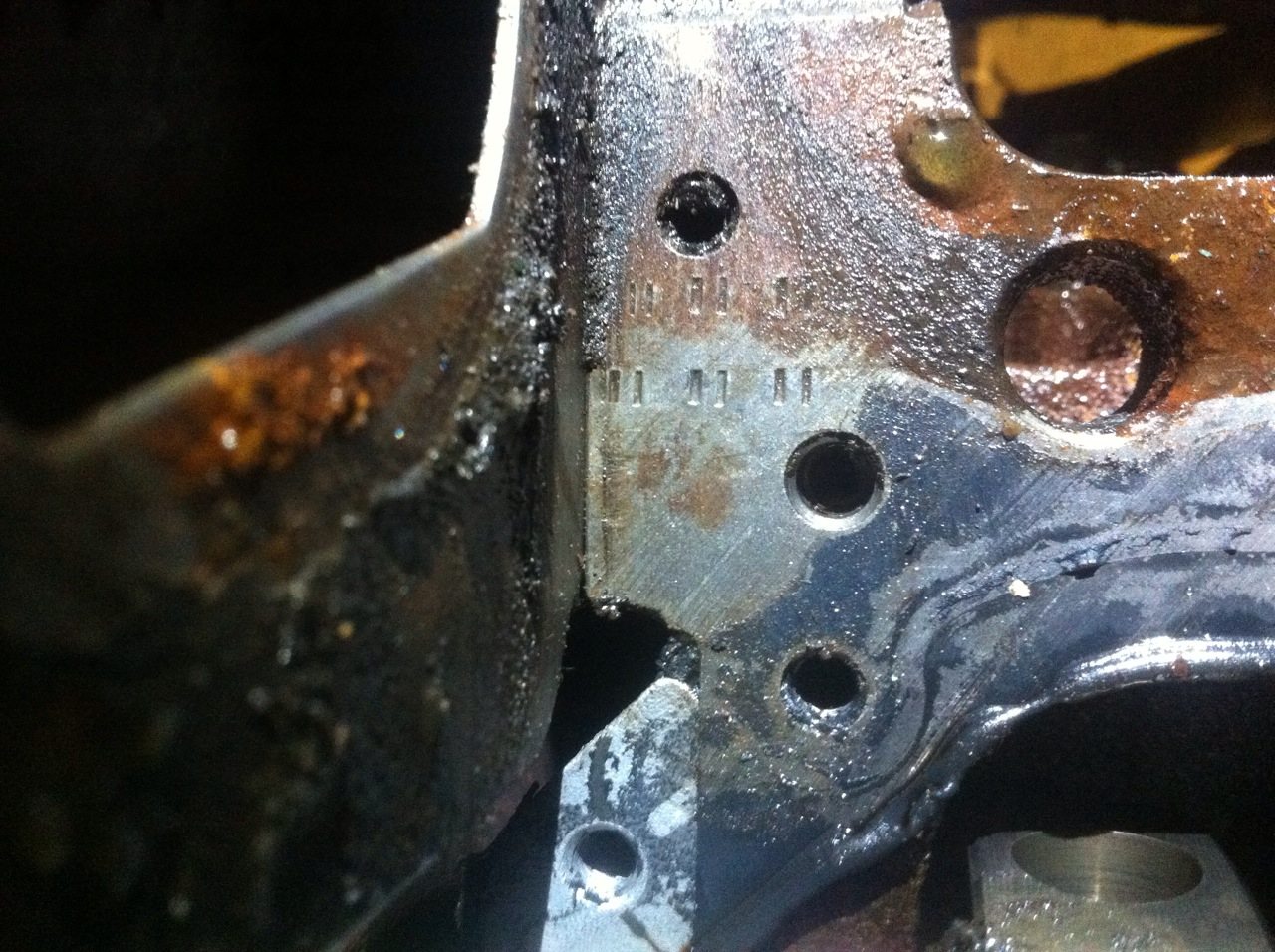 При снятом поддоне и стартере снизу блока обнаружено:
