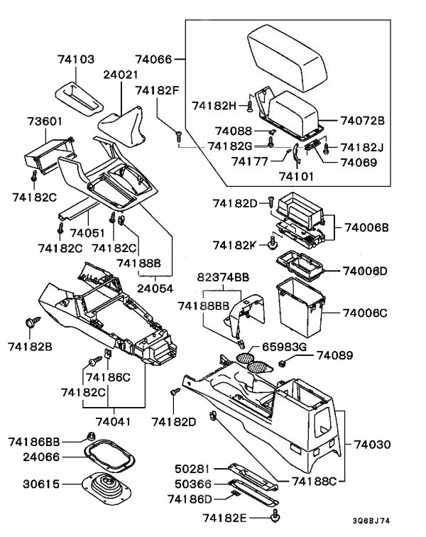 Для того чтобы добраться до рычага, надо снять деталь 24054 (стоит на защелках), предварительно открутив по резьбе ручку переключения и низ центральной консоли 74041 (открутить 4 самореза). Низ центральной консоли вытаскивался трудно, для удобства открутил часть консоли с подлокотником 74030, еще 4 самореза (2 в подстаканниках и 2 на дне подлокотника).