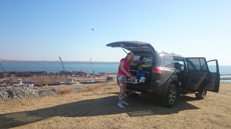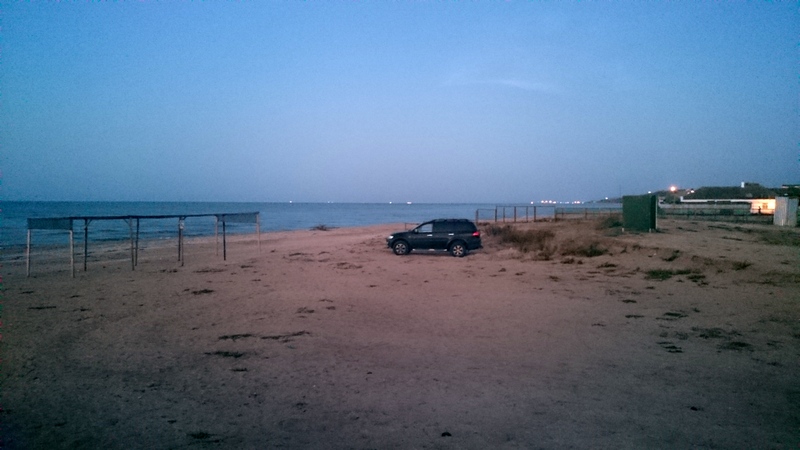 На второй день мы проехали остаток расстояния от Волгограда до Кубани. Ехали через Сальские степи, потом по М4 на Краснодар, и уже от него на Славянск-на-Кубани и далее Темрюк. В Темрюк приехали вечером и тут приняли решение не ехать на паром и не переправляться в ночь, а заночевать на берегу в Голубицкой. Что мы и сделали, встав на ночлег в одном из автокемпингов. При этом отметили, что в 2009 году берег был фактически свободен, а сейчас весь занят разными кемпингами,база отдыха и т.д. В общем на индустрия отдыха месте не стоит. Останавливаться там можно, но меня например напрягло обилие комаров. Не затем я ехал с севера на юг, чтобы отмахиваться от гнуса всю ночь.