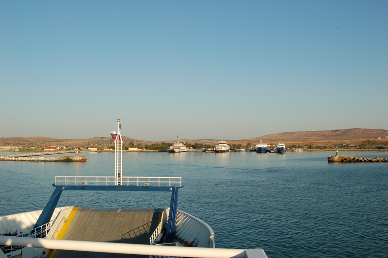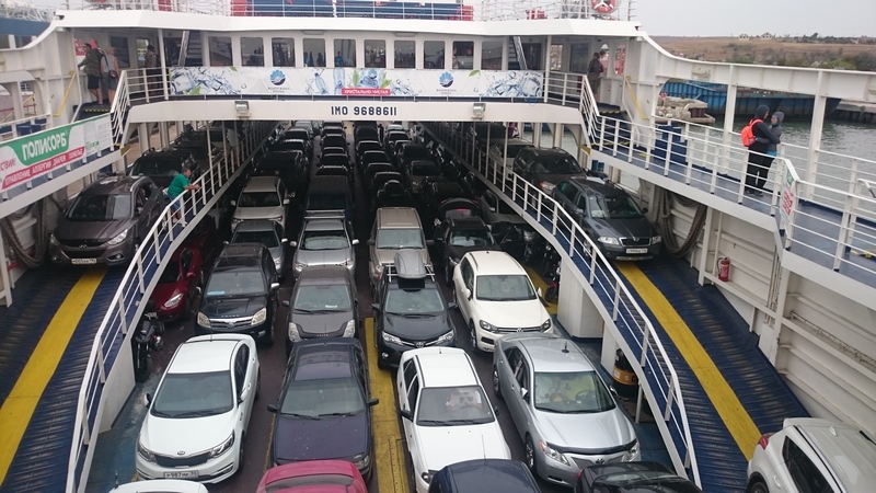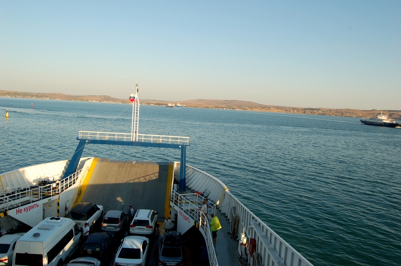 Наутро выехали в сторону парома. Билет я заранее не покупал, т.к. реально на таком расстоянии просчитать сроки приезда невозможно. Но мы фактически нисколько не потратили времени: 10 минут на оформление билета, 30 минут доехать до переправы. Встали третьими на въезд. Перед нами завернули две машины (у них не было билетов, чем думали не понятно), и мы первые из очереди проехали на досмотр, потом сразу же на паром и все. За нами поставили только несколько автобусов и вперед, в Крым!