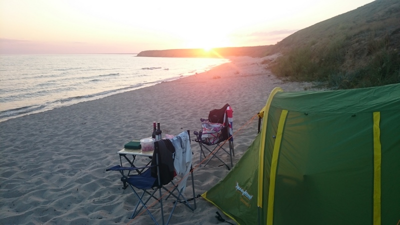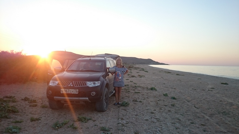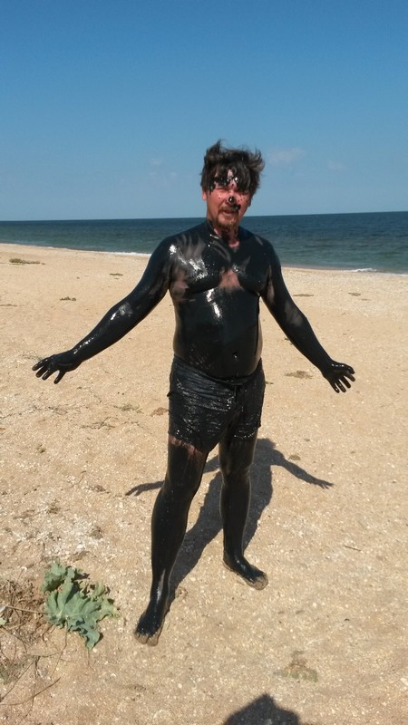 До заката успели проехать только до Курортного и встали там. Ночевали на пляже за поселком. Утром купались, сходили и приняли грязевые ванные в солено-грязевом озере Чограк.