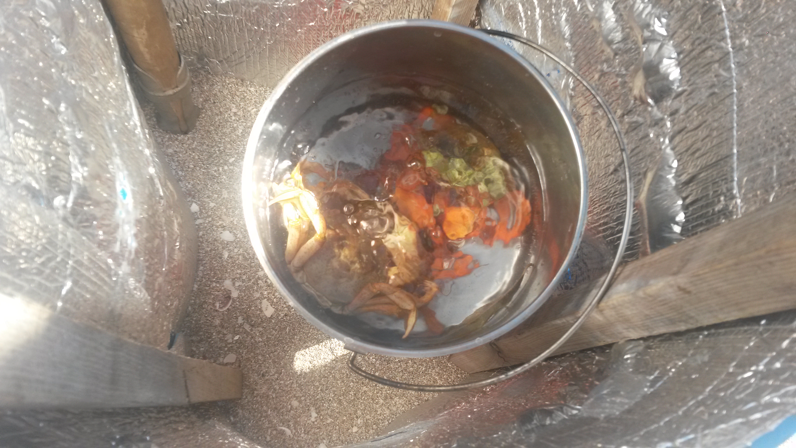 Но Василий - это целый вулкан энергии! Ни минуты на месте. Так просто мы не лежали тюленями на берегу: мы плавали с масками, причем моя супруга первый раз в жизни, ныряли, ловили крабов и собирали рапанов. Крабы и рапаны были сварены. Василий с моей супругой умяли крабов под пиво, а из рапанов был сделан вкуснейший салат с помидорами, благо мы, планируя типа "автономку", много чего привезли с собой.