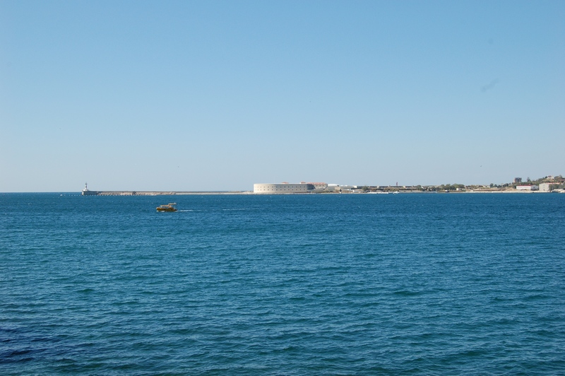 В Керчи мы были около 8.00 местного времени. Но мы то еще жили по своему времени и казалось, что уже позднее утро. Я не планировал тратить время на Керчь в принципе, решив оставить ее на обратную дорогу. Но т.к. мы не завтраки с утра, решено было куда-нибудь заехать и перекусить. Но при этом совместить приятное с полезным и что-нибудь посмотреть. Я решил посмотреть крепость и на ее фоне позавтракать. И при этом совершенно не подумал, что в Керчи их две. Выбрав в навигаторе достопримечательности, ткнул пальцем в первое наименование и мы поехали. И приперлись около 8.30 в Керченскую крепость XIX века! Естественно она не работала. Но охранник, посмотрев на наши номера, разрешил нам зайти и постоять на смотровой площадке.