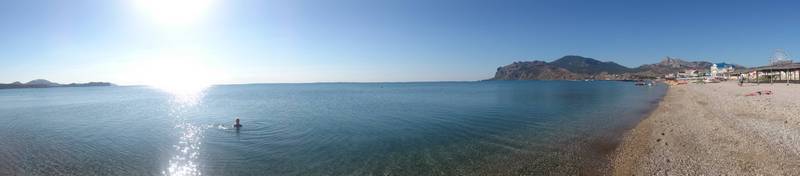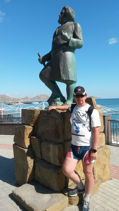 С памятником Максимилиану Волошину кстати интересная вещь получилась. Я знаю про этого поэта, но особо им не интересовался. Т.к. картину покупали через работницу дома-музея Волошина, то немного поговорили о нем. И я для себя узнал, что Волошин оказывается был основоположником российского нудизма! Купаясь на пляже, я как-то не сразу обратил внимание, что он разделен как-бы на две половины и выход с нашего кемпинга как раз был почти по середине. Если стоять лицом к морю, то правая половина пляже обычная, городская, коих много во всех курортных городах. А вот левая - нудистская! Прямо в черте города! Если посмотрите на мои фото, может и увидите. Я конечно видел и раньше нудисткие пляжи, но они обычно находятся в стороне от основных, нужно туда специально идти. А тут прямо на городском пляже. Причем он обустроен как нормальный пляж: спасательный пост, медицинский пункт, аэрарии, жезлонги и пр. И народу кстати там было больше, чем на городском. А еще больше на небольшом пригорке, который возвышается над пляжем и находится за ним. Зрителей там было немало.
