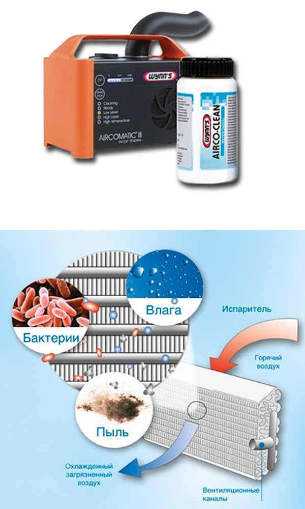 Ультразвуковая очистка кондиционера Езда в автомобилях с кондиционером часто вызывает насморк, раздражение глаз, першение в горле и раздражение бронхов. Кроме того, воздух из кондиционера может иметь неприятный запах. Это происходит из-за наличия бактерий на испарителе. Пыль и пыльца растений, которые разносятся ветром, являются идеальной средой для быстрого размножения бактерий. При включенном кондиционере эти микроорганизмы попадают в салон автомобиля и вдыхаются с воздухом пассажирами. Обработка системы кондиционирования установкой Aircomatic® III и расходной жидкостью Airco-Clean® очищает поверхность испарителя и воздуховоды на длительный период времени.