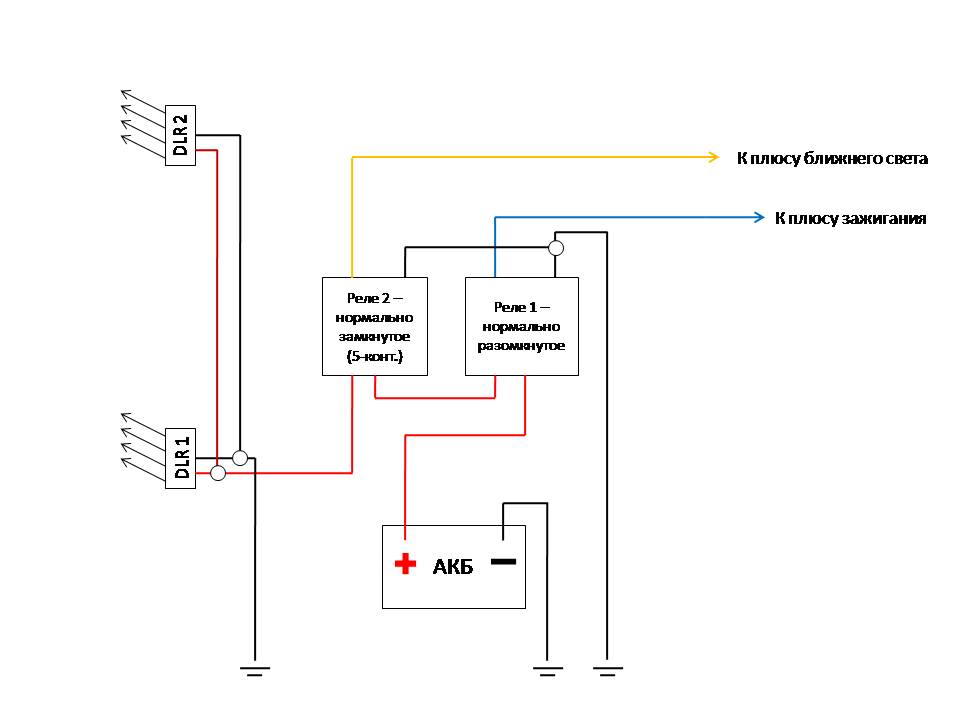Схема подключения прилагается. По такой схеме, дневные огни загораются, как только включаешь зажигание, гаснут при включении ближнего света фар. Можно сделать, чтобы светили слабее, но не выключались. Или чтобы выключались принудительно кнопкой, дополнив схему. + зажигания взял из салона (предохранители под рулем), + ближнего - из блока предохранителей под капотом.