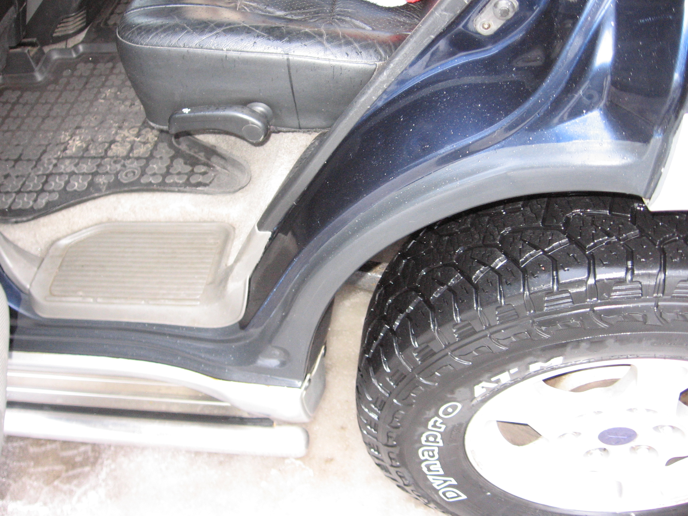 С пассажирской стороны покрасил в цвет, но краска облезла (говорила мама - не ложи на полиэфирку кислотный грунт), с водительской не стал заморачиваться, покрасил кисточкой, чёрной эмалью. Когда дети обдерут/затопчут, покрашу обе арки в цвет и накрою бронеплёнкой.