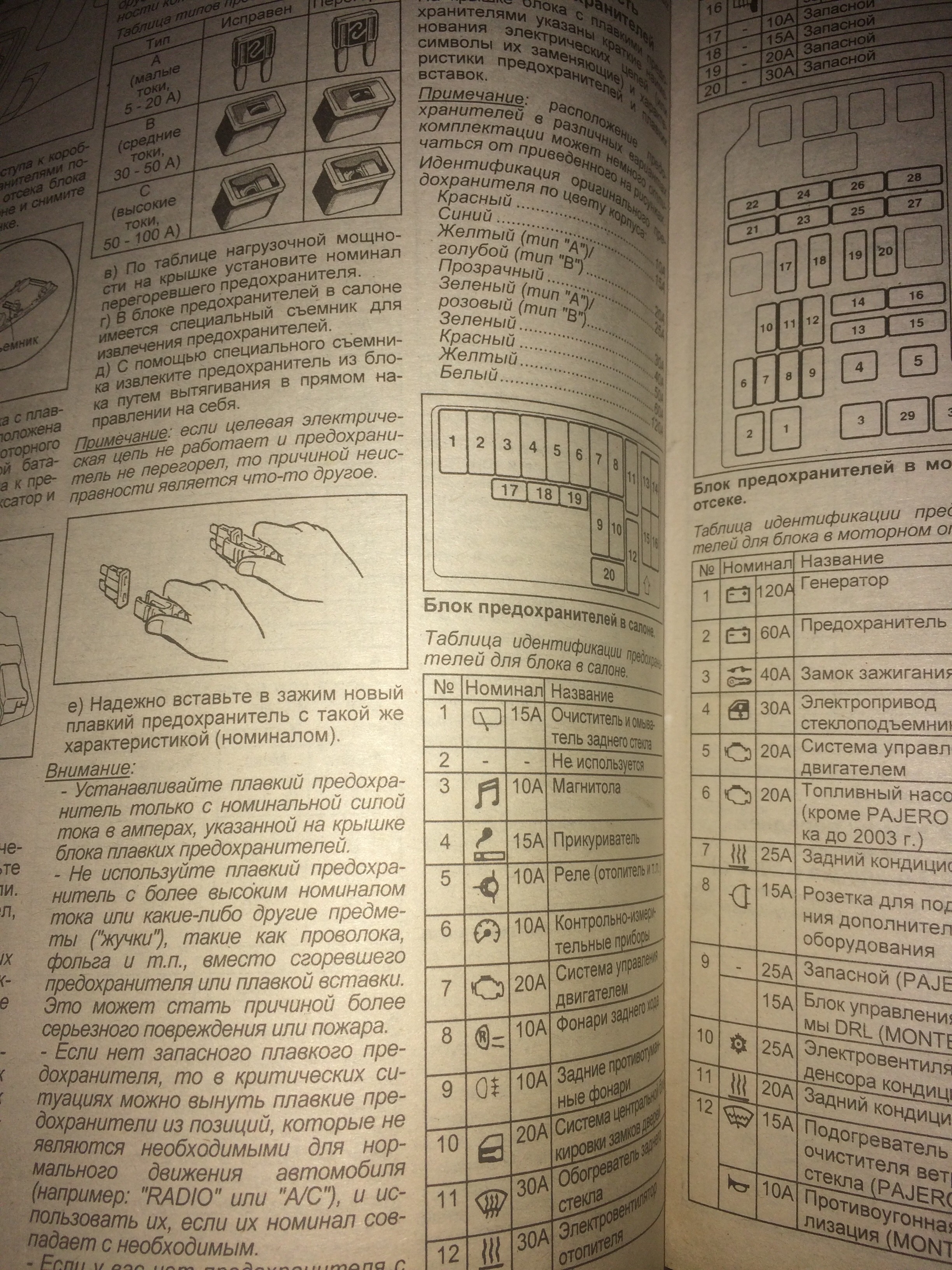 привет, ещё сам прикуриватель посмотри разбери, в нем имеется плавкая вставка которая первой перегорает, а затем уже предохранитель, у меня на монтерике из-за электрического насоса 2 прикуривателя сгорели, а предохранитель был целый, пришлось паять медную вставку для того чтоб прикуриватель работали.ГАНС писал(а):Блин, перелопатил сегодня данную купленную книгу по паджеро-3, и нигде не нашёл упоминания про предохранителиDenVer писал(а):Вот в этой книге http://www.autopapyrus.ru/catalog/e/mit ... ntero/602/