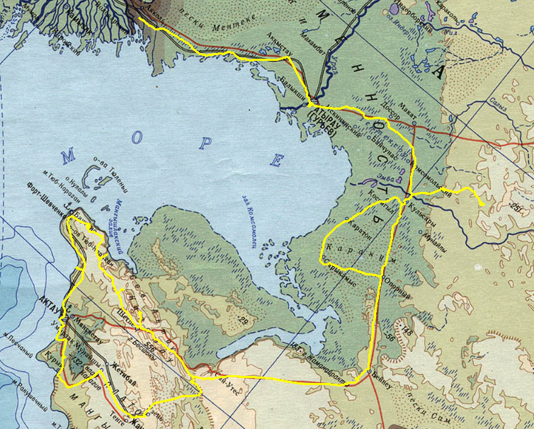 Форт Шевченко - Актау 141 км По асфальтовой трассе вдоль побережья. Посещение пляжей голубой Бухты. Актау - Шопан-Ата 211 км По асфальту до нового Узеня, далее грунт, вдоль песков, до Шопан - Ата . Посещение впадины Карагие, подземные мечети.