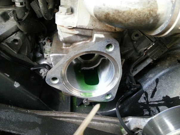 5. снимаем корпус термостата вместе с патрубком и задираем патрубок вверх, чтоб антифриз не вытекал.