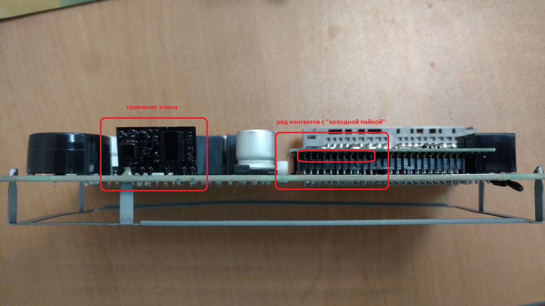 но меня снова ожидало фиаско , хотя процедура рабочая , что и показал снова опыт перепрописки ключей на японский этакс на котором ключи виделись и запоминались , при попытке обратится с проблемой в дилерский сервис мне сказали - ну ключи не всегда можно прописать без MUT . типа бывает зависет процедура прописки, не закрывается процесс и соотвественно новый сеанс не открывается, муть короче , но в моем случае при шаманстве с дверью, ключем, аварийкой и проводком, этакс стабильно отзывался закрывая и открывая двери, но категорически не хотел видеть передатчик ключа, было опробовано несколько ключей, толку ноль, делать было нечего, было решено подключить на столе этакс ( всего два провода и 12в с лабораторного) и посмотреть, что валится с приемника в рабочем японском этаксе и на родном, в итоге, на сборке приемника этакса нам надо было понять что за ноги и для чего, итак , питание две ноги , одна синхра с проца (с платы что стоит на ногах на основном модуле), ее было явно видно на осцилографе, и еще одна нога собственно сам выход, где при нажатии кнопки на пульте ключа были видны посылки кода, подключив родной этакс все было по питанию в норме , но синхры не было , соотвественно приемник ожидаемо молчал. хотя питание на нем было в норме, внимательное рассматривание показало, что край платы процессора "висит в воздухе" и нет контакта как раз на тех контактах которые нужны приемнику , дело пяти сек плюс паяльник, и вуаля, я вижу и синхру и приемник отдает код передачи на проц при нажатии кнопок на пульте, дальнейшее внимательное рассмаривание японского этакса показало что и на нем эти же контакты имеют холодную пайку , при том в большем обьеме, но как то на соплях это работало, но нестабильно