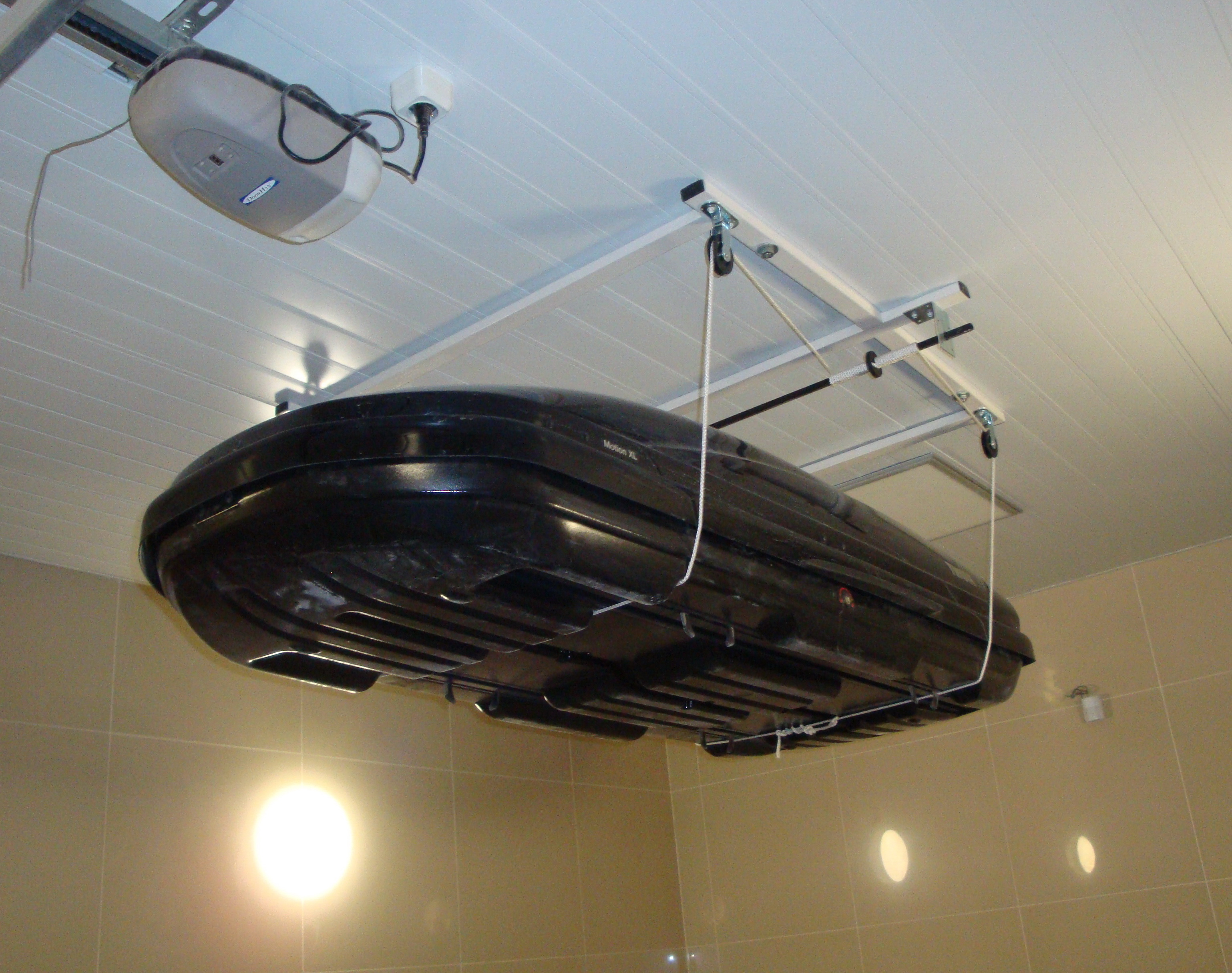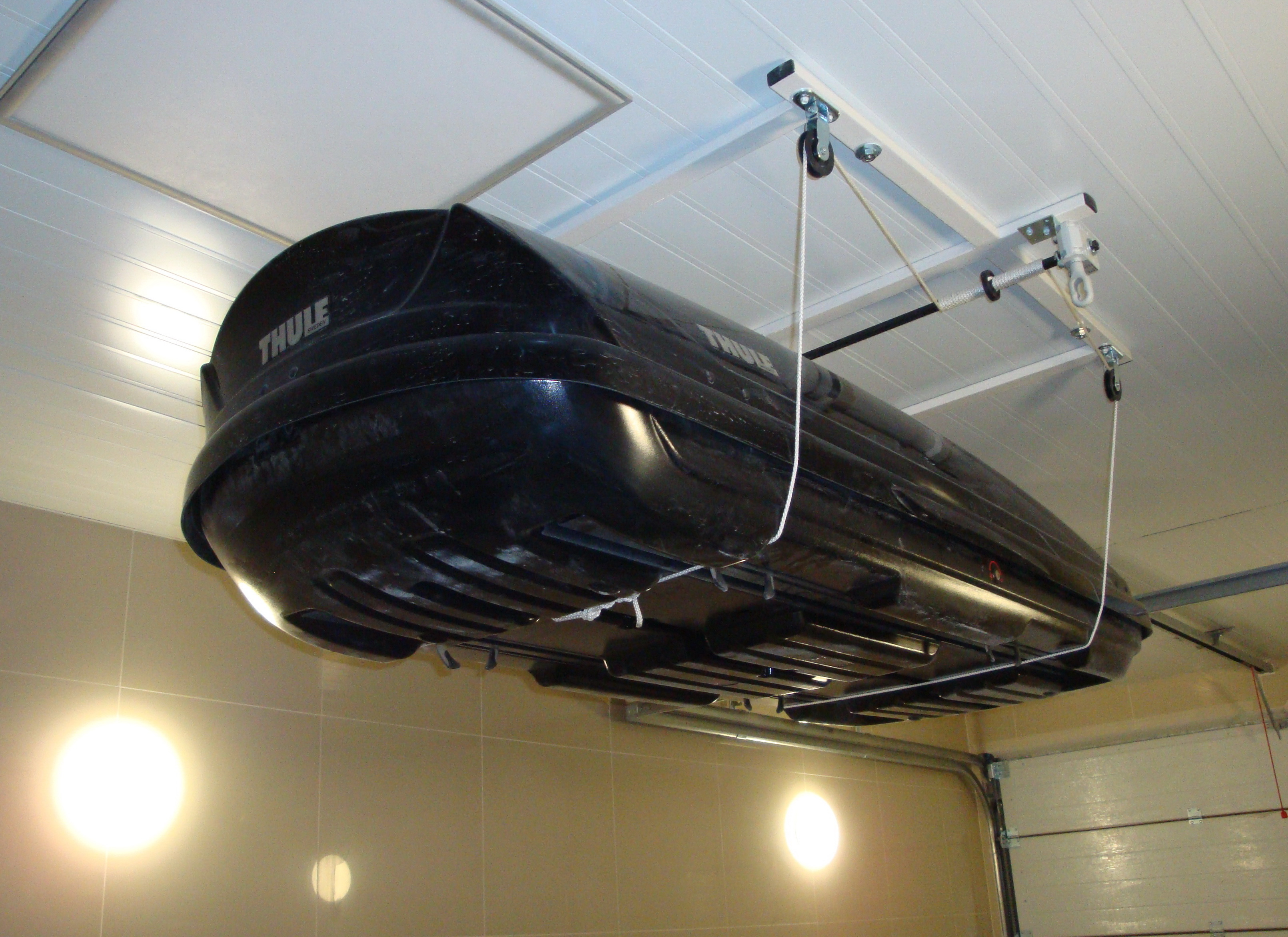 Приобретал себе комплект Thule (дуги, бокс, велобагажник) и дилер Thule-вский чуть не насильно впихнул мне устройство для подъема и закрепления бокса на потолке гаража. С очень хорошим дисконтом, практически в пол-цены.