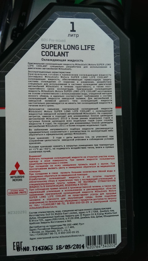 Это Long Life Coolant и в наш двигатель он не идёт. Наш антифриз по тех. руководству - это Super Long Life Coolant. Лично я использую Mitsubishi Super Long Life coolant - MZ320292, готовый,до - 51, 4 литра - в районе 1800 руб. Допускается смешивание с жидкостью заводской заливки.AlexanSNZ писал(а):Мужики, подскажите MITSUBISHI MZ 311986 - это концентрат или уже готовый?