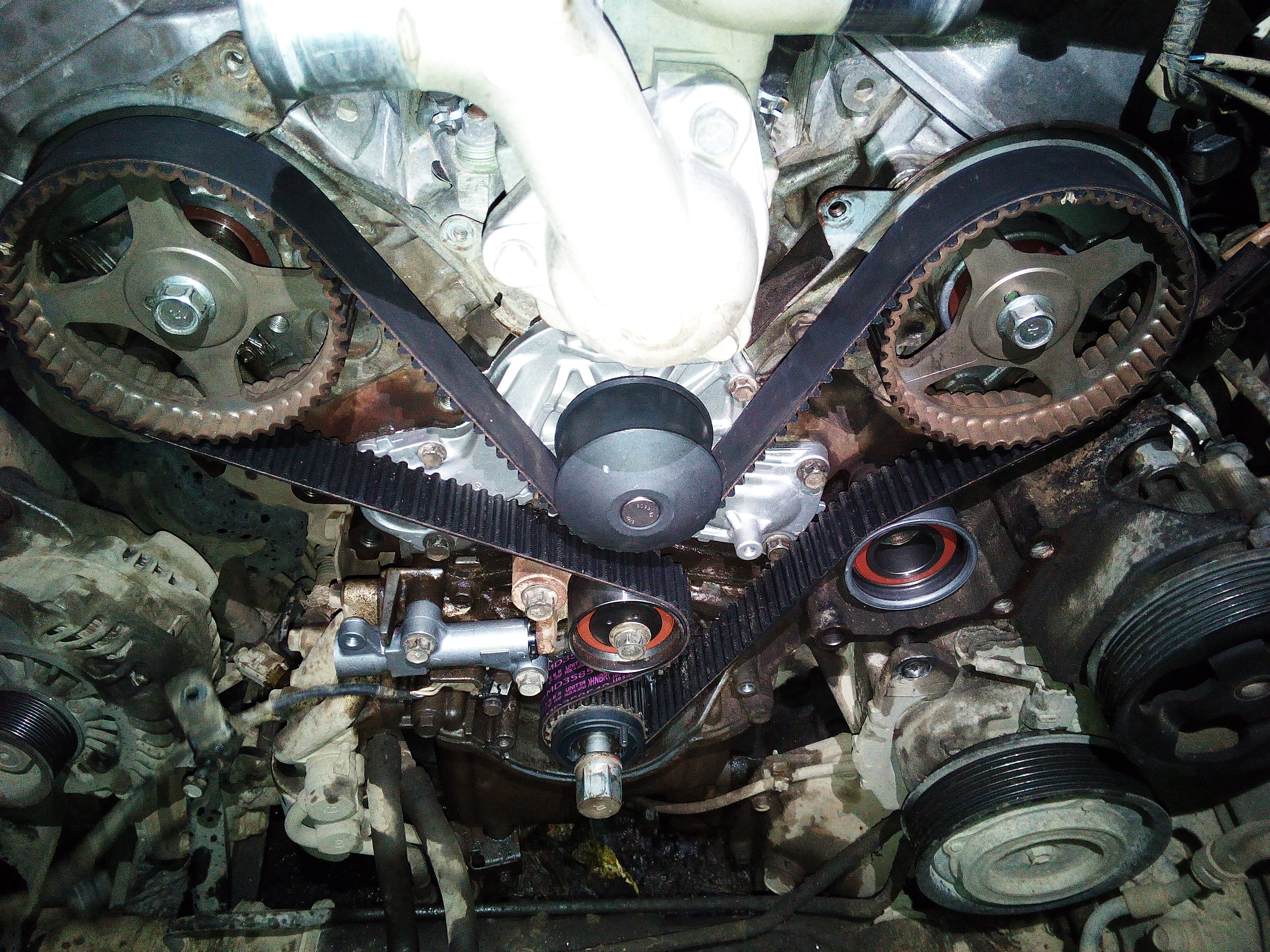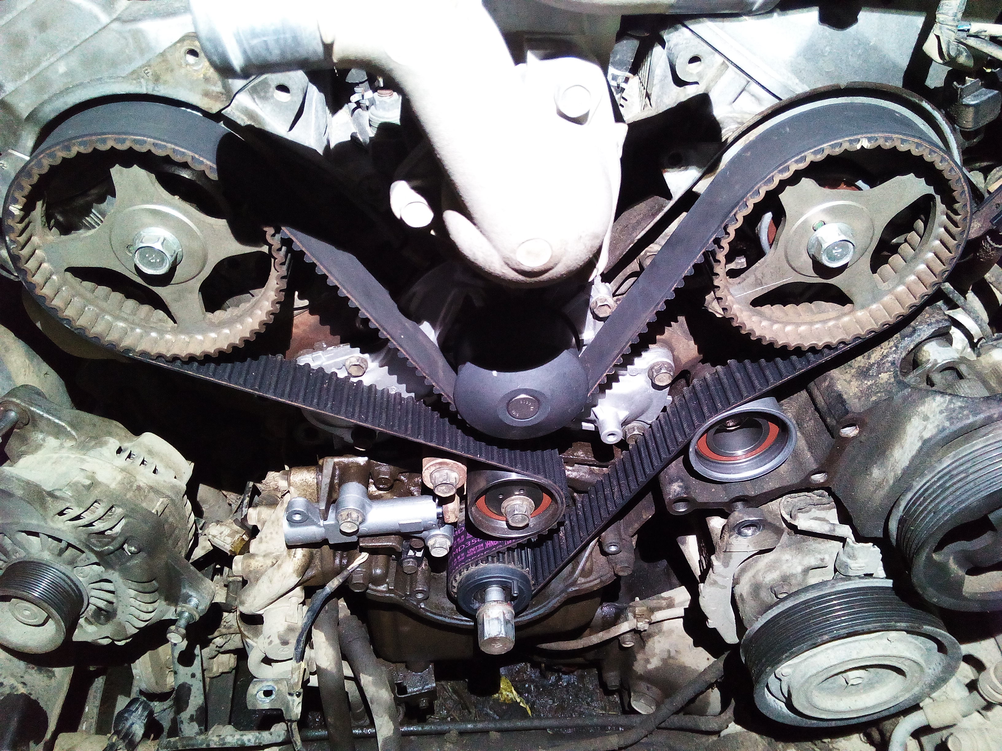 был еще один прикол. Начал примерять новый ремень SUN , но он оказался короче оригинального (купил ремень от 3.0 6G72 SUN A608YU32MM, а мне нужен на 3,8 6G75 SUN A633YU32MM разница в 8 зубов ) Меня посетила пичалька(((( Где в воскресенье вечером в 19 часов найти новый ремень ГРМ. Пришлось экстренно обзванивать магазины и ехать. Нашел оригинал за 4600 руб.