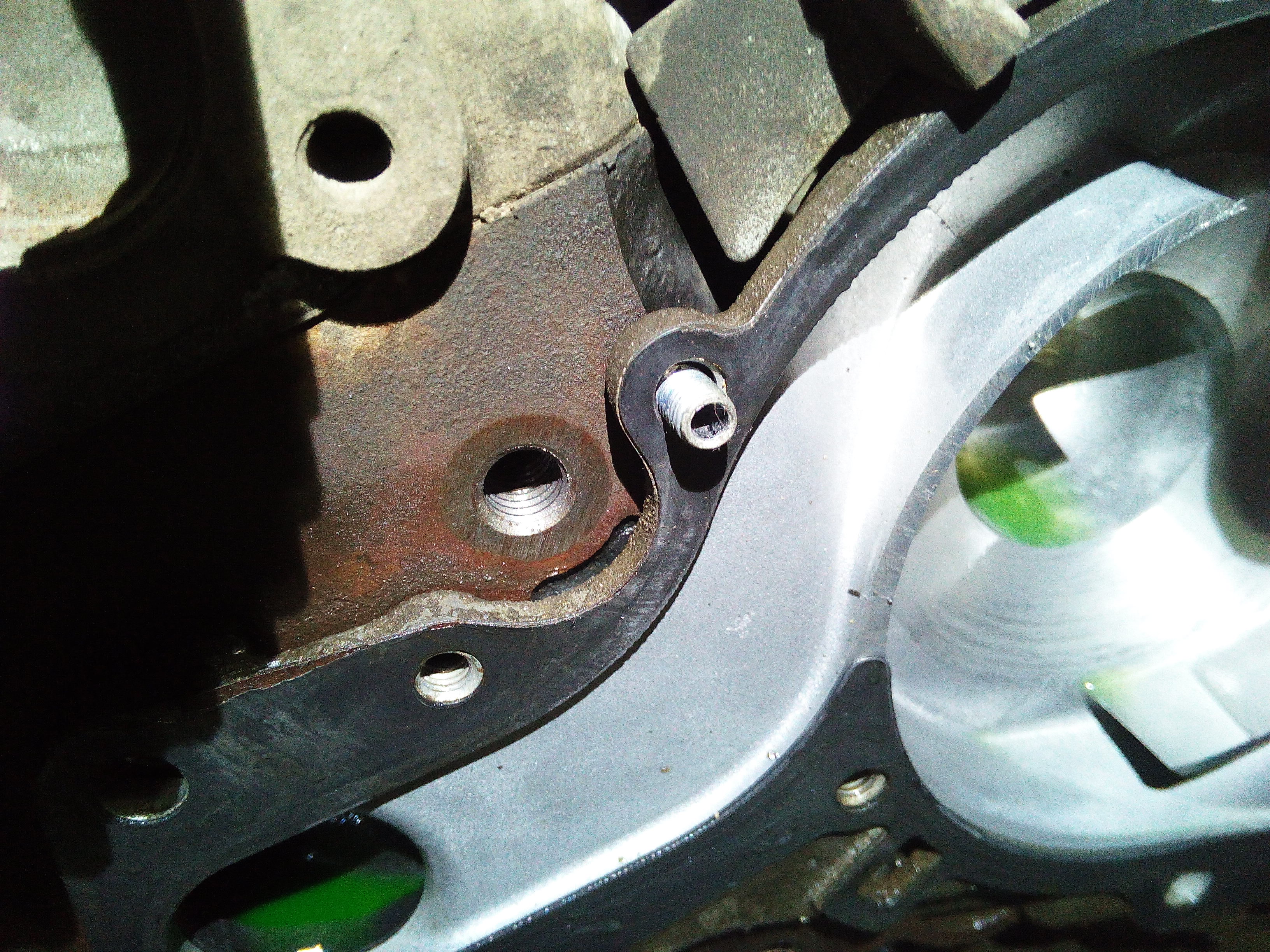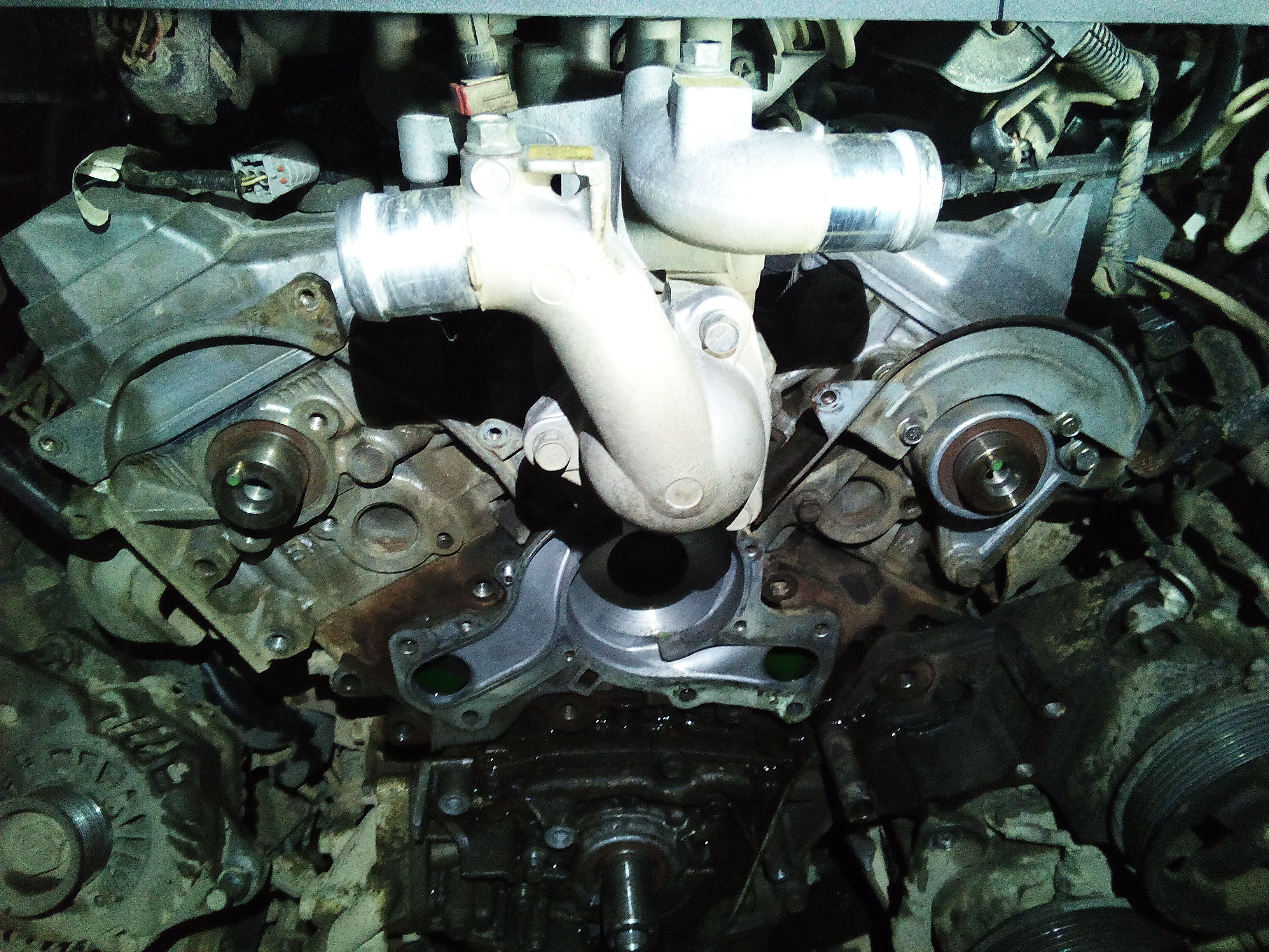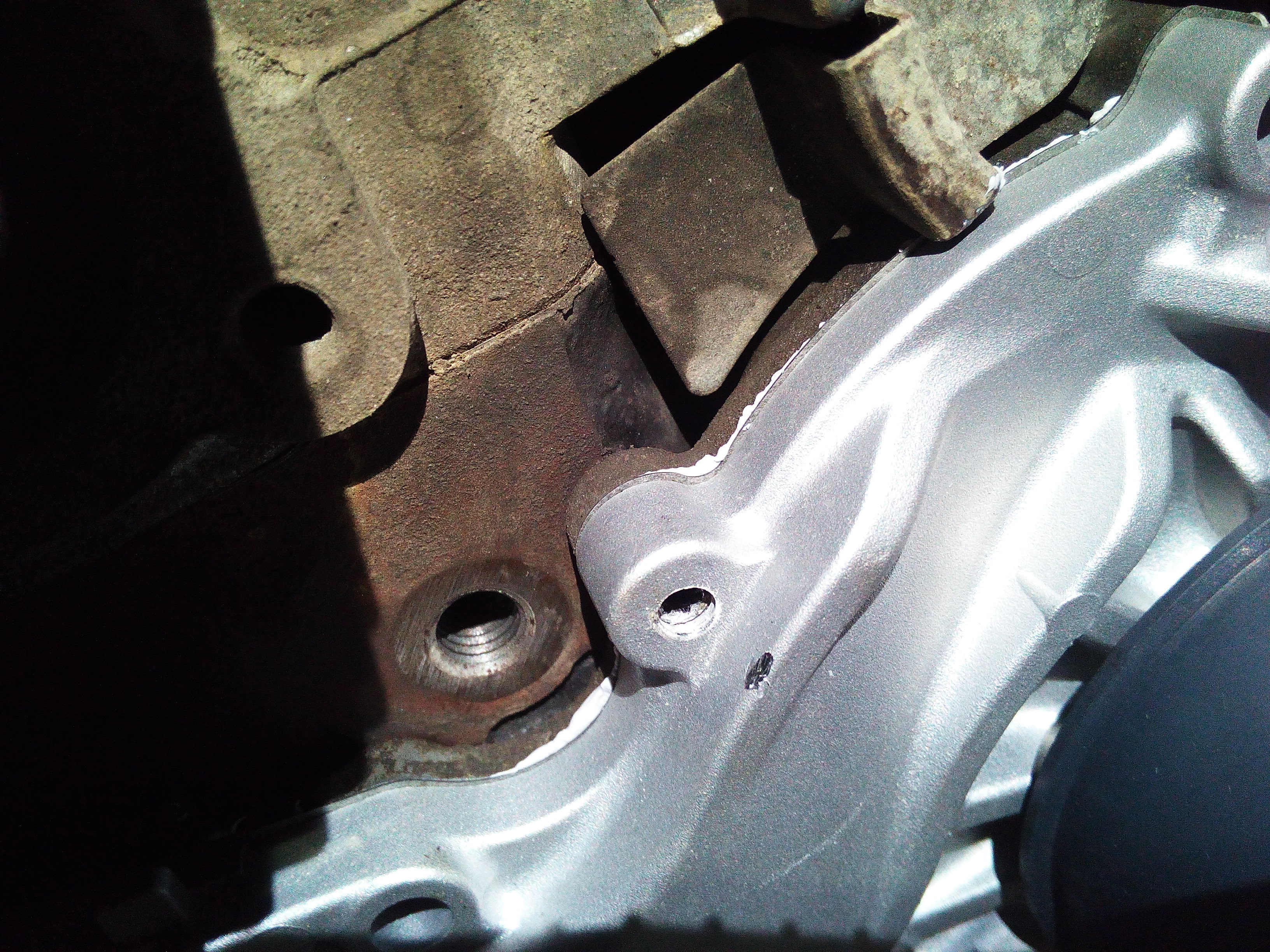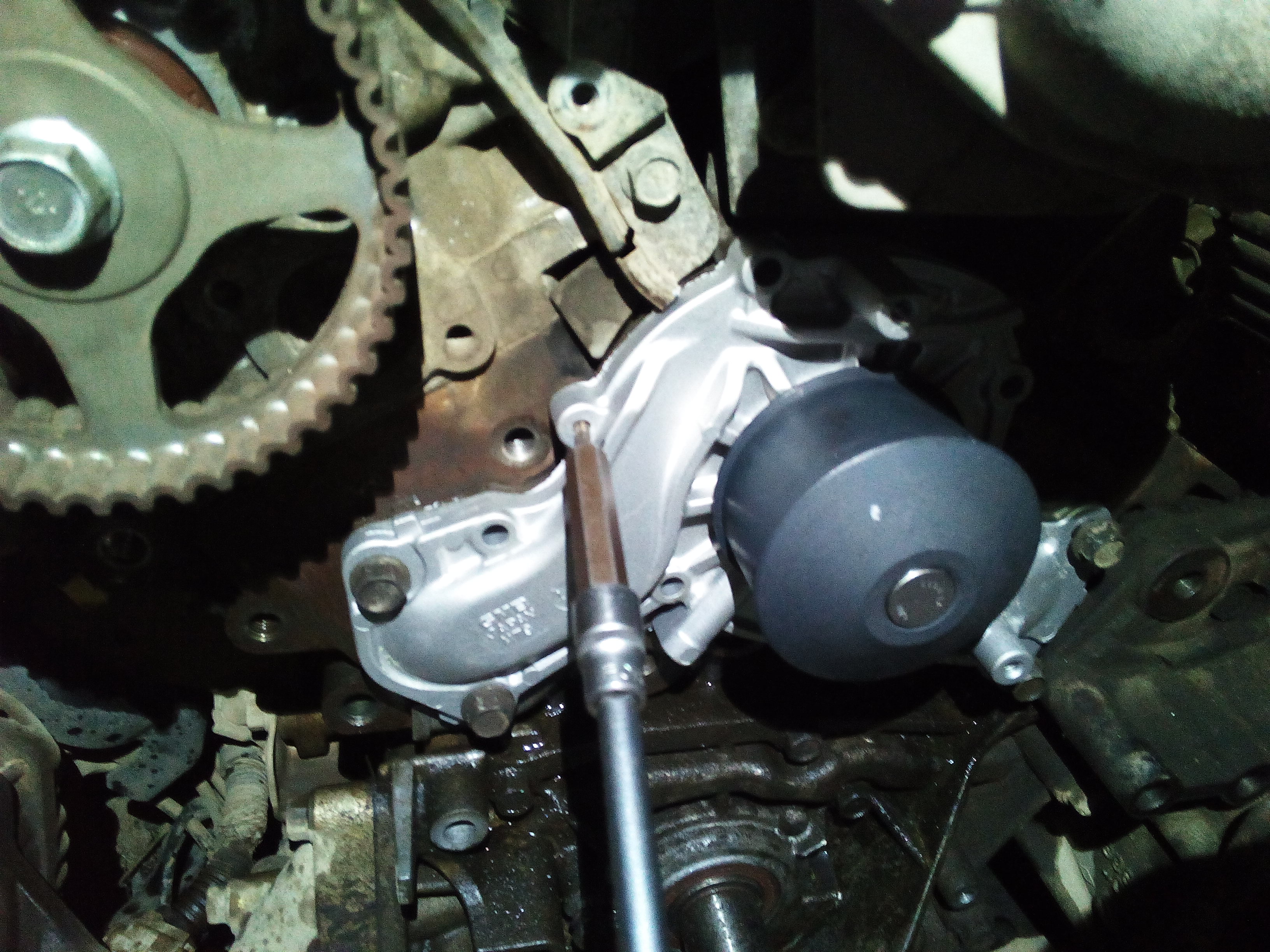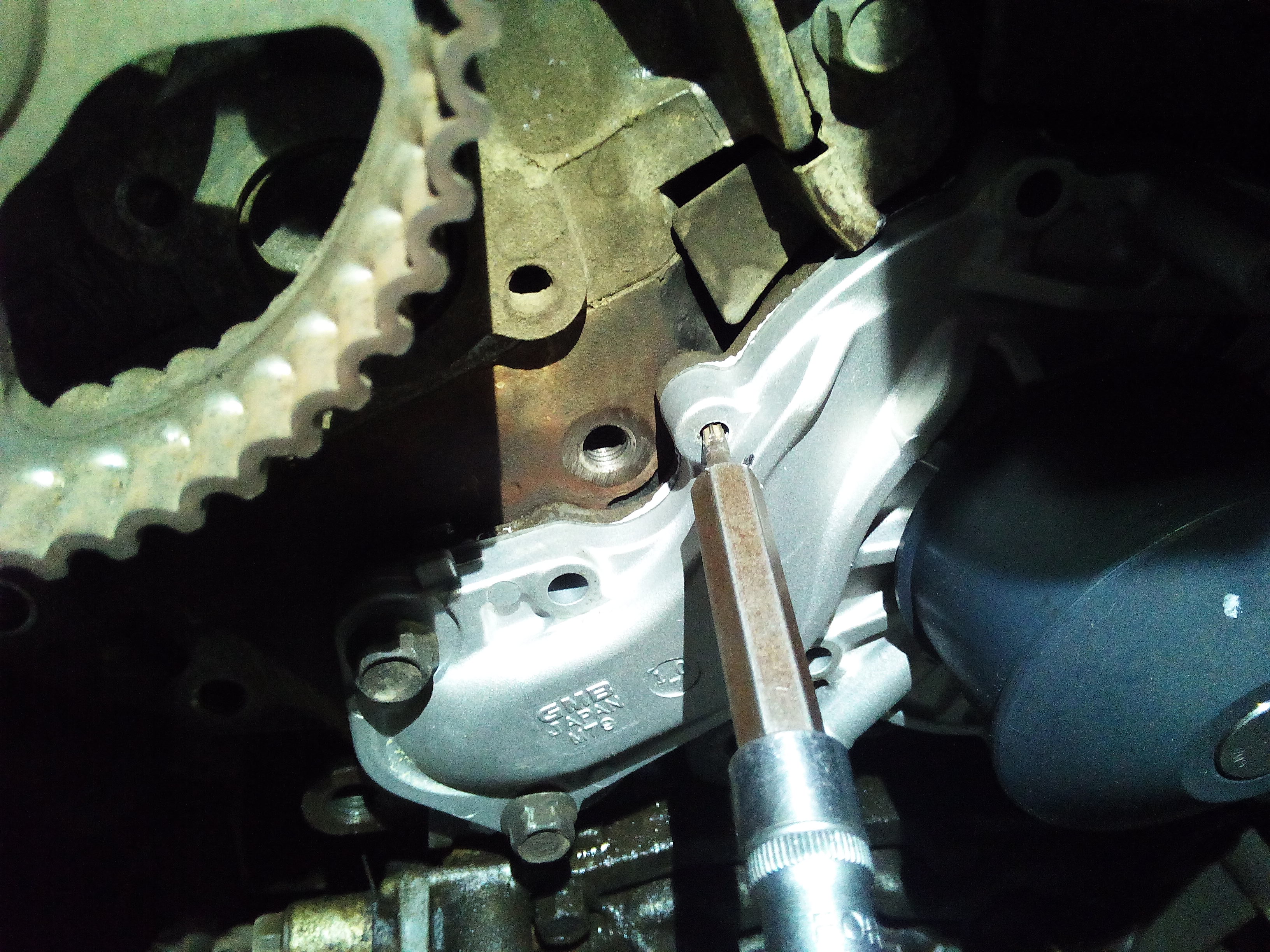 а вот тут самое интересное: Инженерам Митсубиси я бы руки оторвал за такие выдумки с помпой. Все болты откручиваются/закручиваются снаружи, а чтобы открутить один болт, нужно разобрать пол двигателя , блок термостата, чтобы снять ВЕС корпус помпы. Я высверлил болт и выкрутил его с обратной стороны, при закручивании обратно вбил туда звездочку подходящего размера и закрутил изнутри. УРОДЫ!!!!!!!!!!