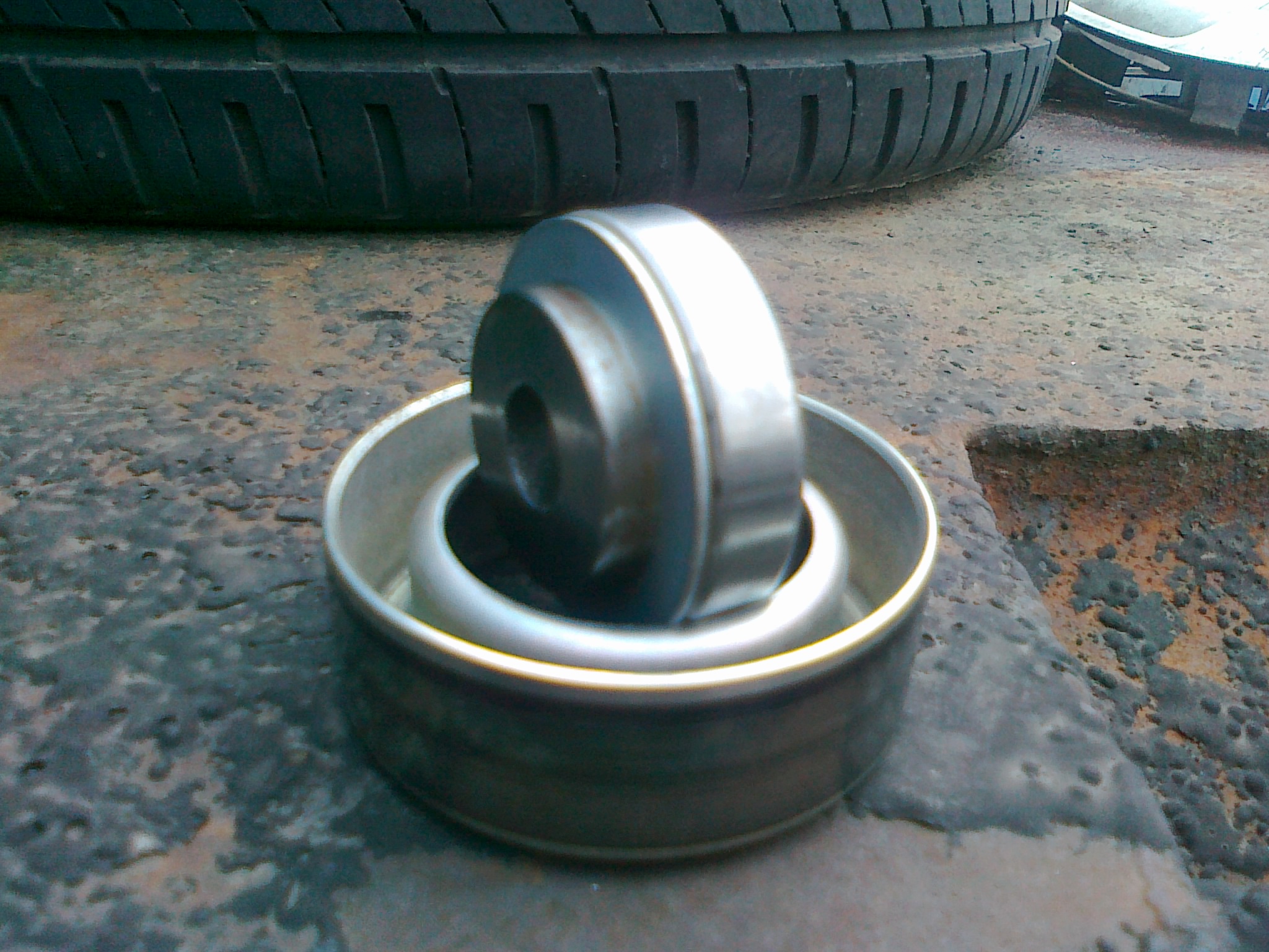 Перед этим надо ослабить болт крепления нашего люфтящего ролика(голова на 14). Получаеться так- ослабили болт, левой рукой натянули натяжной ролик, правой быстренько открутили ослабленный болт, сняли ролик, отпустили натяжитель. Ремень не снимается. Подшипник был выпресован,- люфт очень большой, внутренняя обойма хитрая, такой подшипник не найти. Покрутил повертел его и решил менять ролик всборе, заморачиваться с поисками чего-то похожего и выточкой подгонкой не захотел.