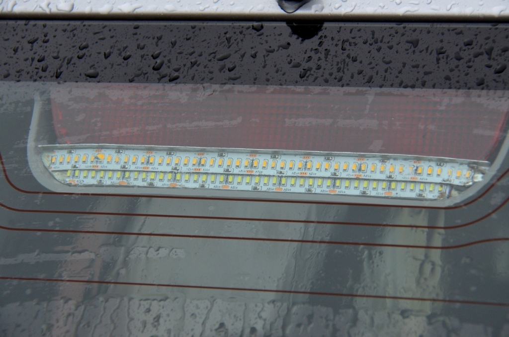 немного завалил площадку с полосками вверх, иначе края полоски выходят за козырек-обрамление Козырек в том месте парлаллелен стеклу как бы) и будет сильная засветка стекла. по количеству - см фото, меня вполне удовлетворяет. но видно, что светит вверх много ( крыша навеса сильно освещена) . можно было бы отражатель над полосками поставить - направить свет не вверх - но много закроет стопсигнала.