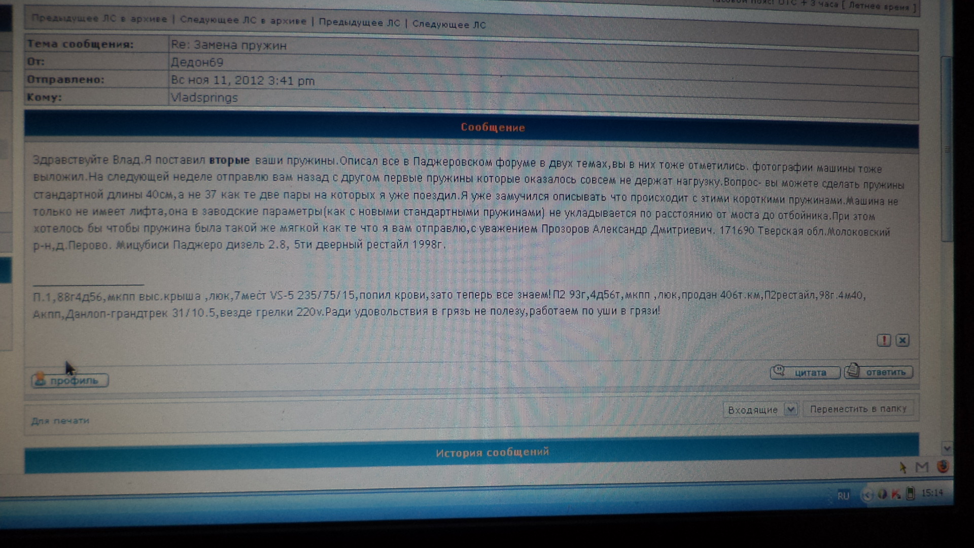 По поводу замены пружин.Я отправил с другом в Питер первый комплект,ему сказали что он вам нафиг не нужен.Могу вернуть вам и второй комплект,таким же макаром.По поводу выкладывания на форуме позитива или негатива - он форум для того и существует чтобы страна знала своих героев.Тем более что я русскими буквами написал что это мое личное мнение и я его ни кому не навязываю!