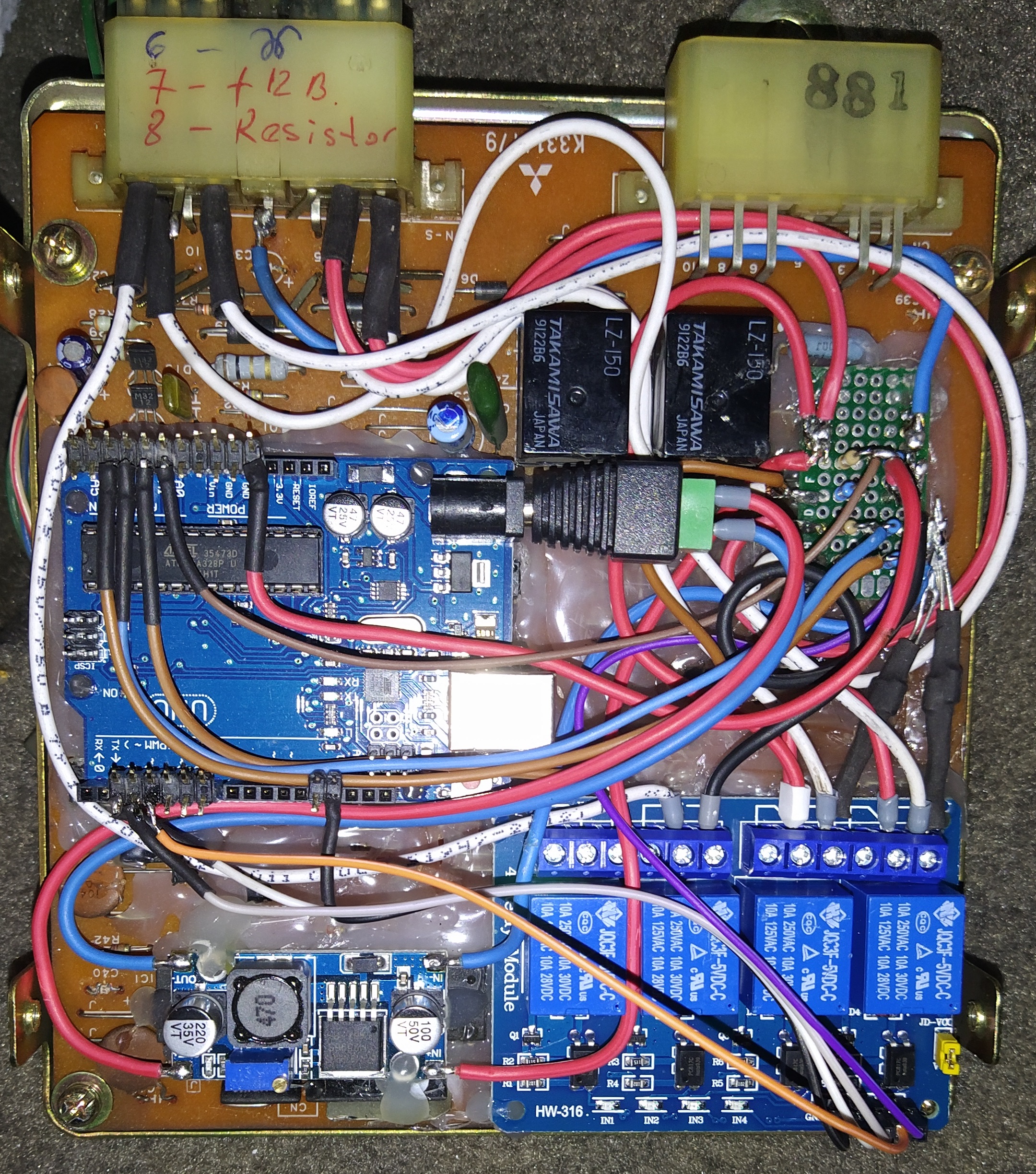 Машина досталась с силовым тумблером который был подключен напрямую от аккумулятора до свечей. Две свечи были на 12В две на 6В. Прочитав форумы стало понятно, что родной блок не будет работать с неродными свечами и так как очень сильно смущала стоимость этих самых свечей плюс было не понятно живой блок управления или нет было принято решение сделать блок управления на Arduino UNO. Восстановил оба реле и еще подключил индикацию нагрева (спиральку) на приборной панели. При использовании SUPER QUICK GLOW индикация с завода не подключается. Пришлось припаять провод прямо к дорожке приборной панели.