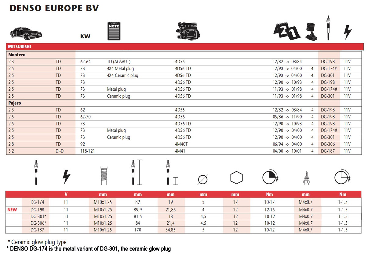 Там обнаружил для своего 4D56TD, 73kW/99hp (TD - Turbo Deasel ?) соответствие нескольких свечей - DG-174, DG-198 и DG-301.