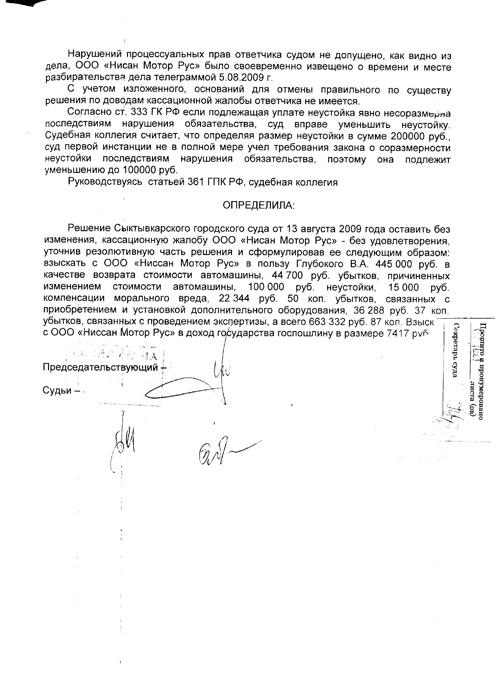 В сентябре 2008 года аналогичное письмо было направлено представителю завода-изготовителя в нашей стране ООО «Ниссан Мотор Рус». По отметкам в Паспорте транспортного средства, оно являлось импортером автомобиля. ООО «Ниссан Мотор Рус» в просьбе отказало, сославшись на то, что автомобиль приобретался и обслуживался не у официального дилера. Получив такой ответ, покупатель обратился в суд с иском к ООО «Ниссан Мотор Рус» о замене автомобиля Nissan Almera Classic на новый, взыскании неустойки, компенсации морального вреда и понесенных убытков.