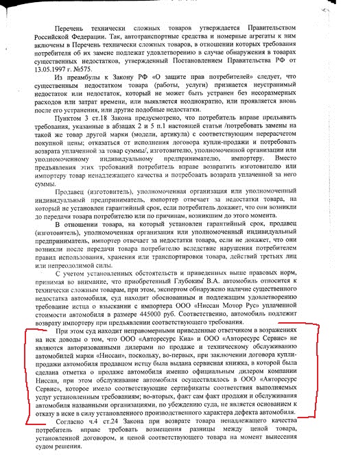 Доводы ООО «Ниссан Мотор Рус» о том, что автомобиль приобретался и обслуживался не у авторизованного дилера, суд признал неправомерными, поскольку при заключении договора купли-продажи покупателю была выдана сервисная книжка с отметкой о продаже и предпродажной подготовке именно официальным дилером компании Ниссан, а обслуживание проводилось в организации, имевшей сертификаты соответствия выполняемых работ установленным требованиям.