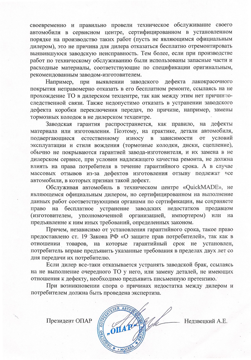 3. Так же в законе есть положение о том, что любые условия, ущемляющие права потребителя, недействительны, даже если он сам расписался под ними. Т.е. ограничивать гарантию любыми условиями типа прохождением ТО у официалов нельзя. ст. 16 ЗоЗПП