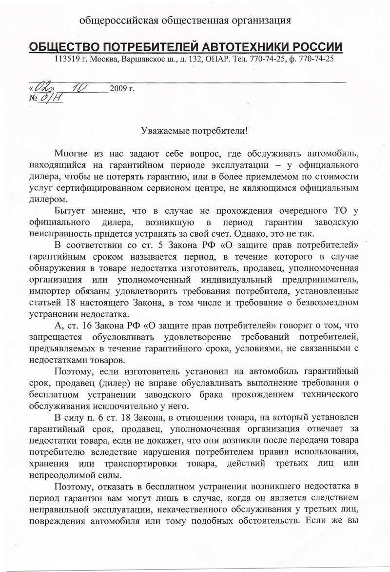 До кучи от себя. Ссылку найти не смог, но точно помню, на аут-клубе официальный представитель Рольфа закон цитировал правильно. Дескать, откажем в гарантийном ремонте только если поломка именно из-за неправильно проведенного ТО. Но, понятное дело, "обещать - не значит жениться".