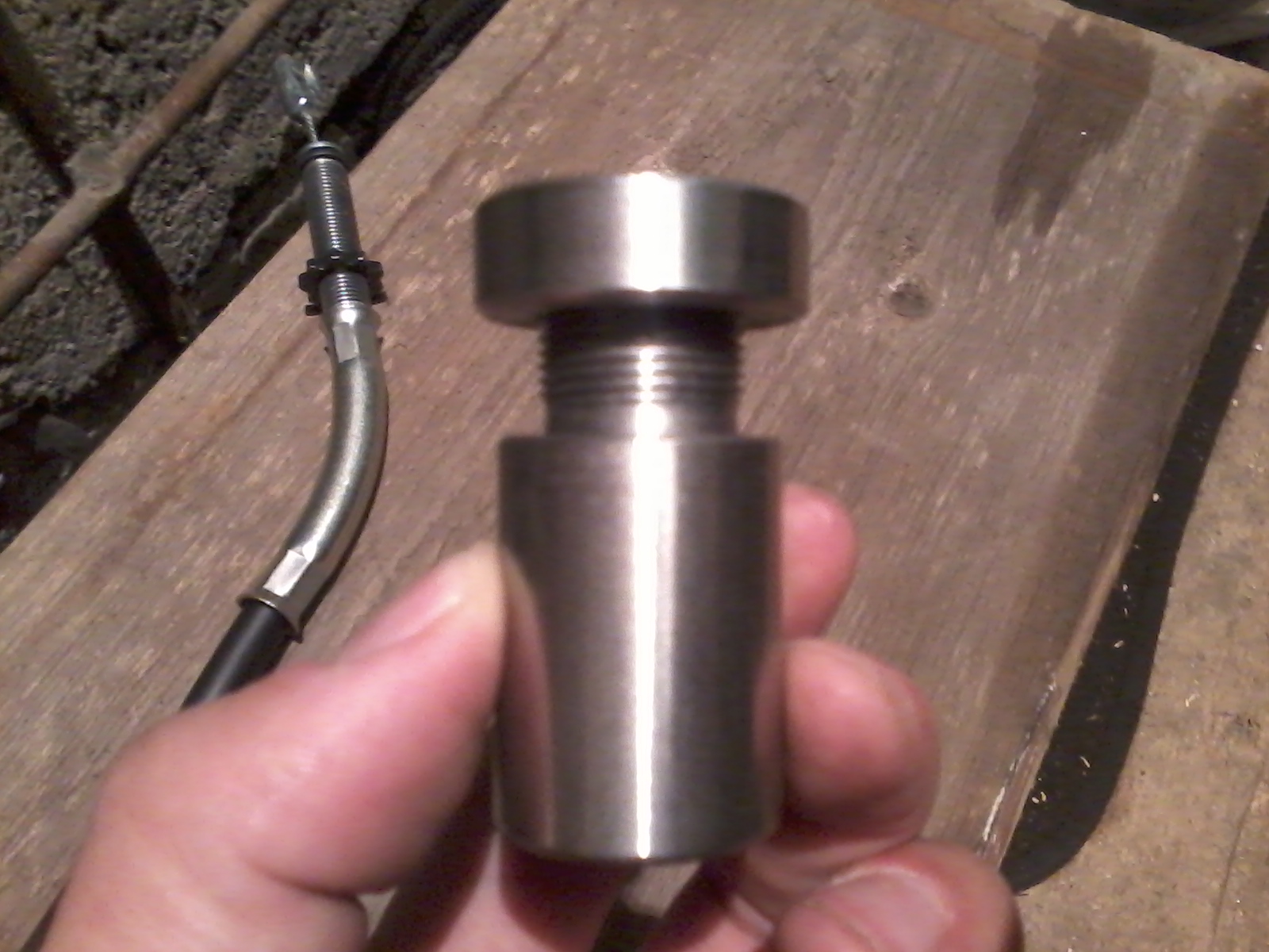 дальше сверлим там куда будет входить тросик сцепления в салон и ставим вот такую штуку,которую заронее заказал токарю.трубку вваривать не хотелось поэтому решил так.