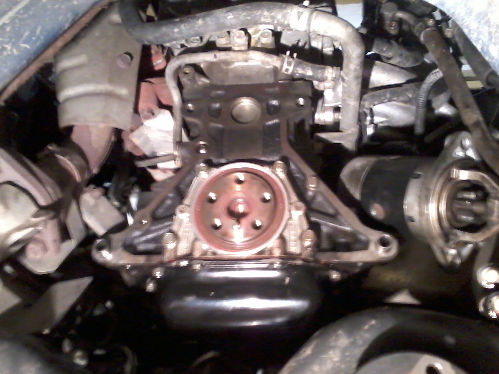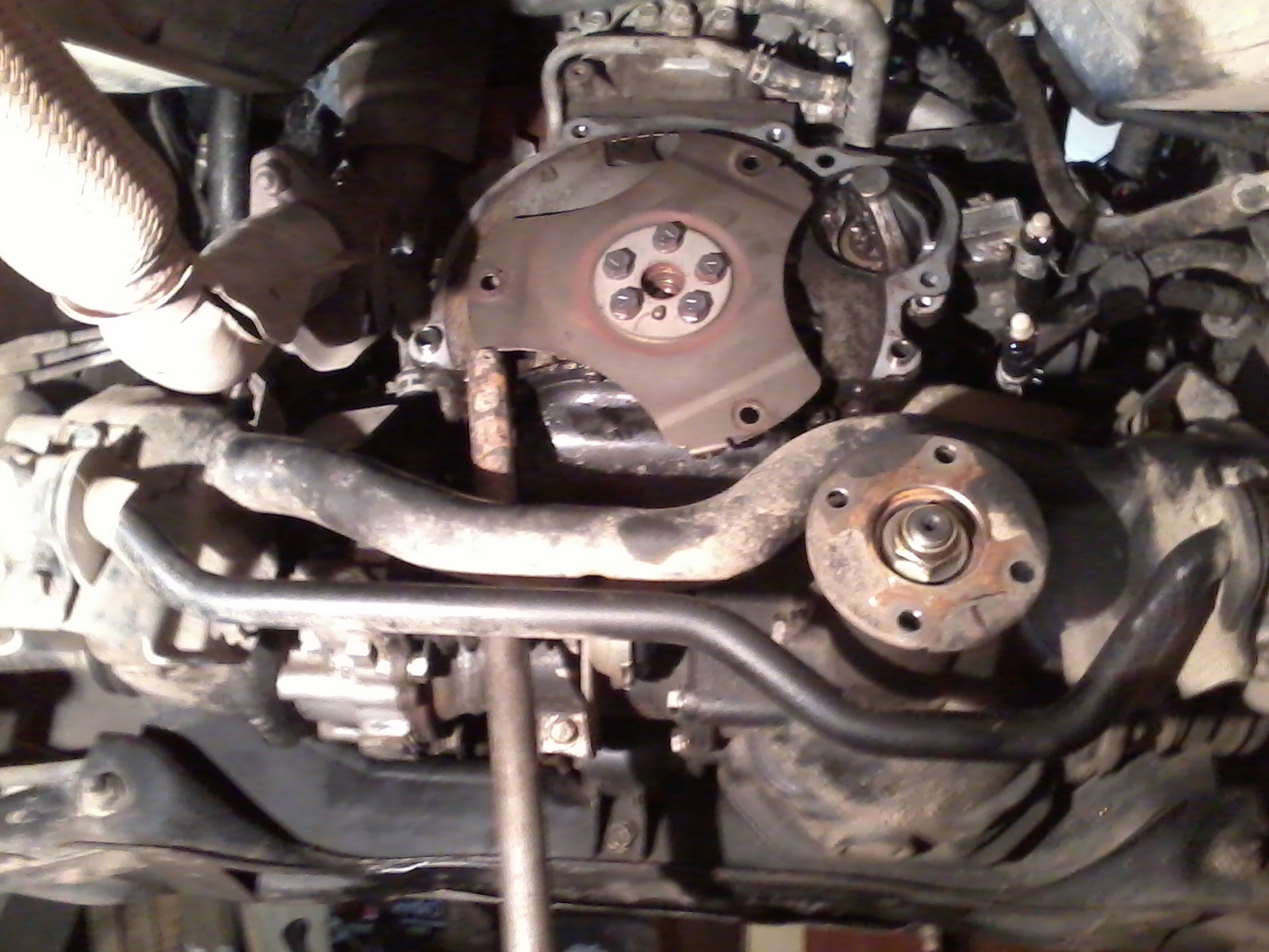 дальше откручиваем пластину крепления ГТР и устанавливаем туда маховик,диск ,корзину,все центруем.перед всем этим еще заменил сальник колена,подтекал.
